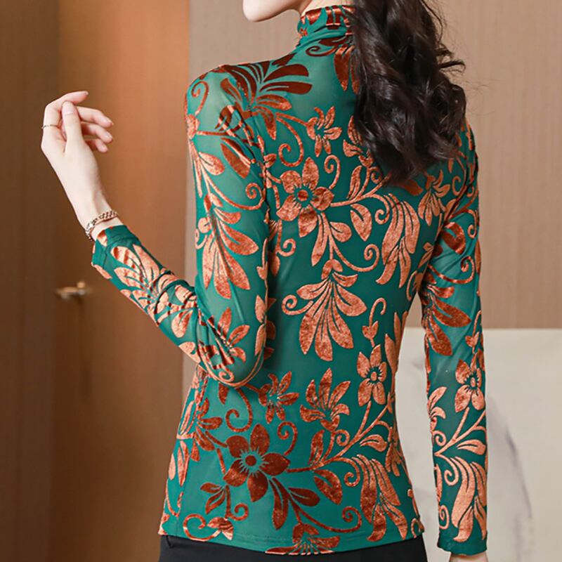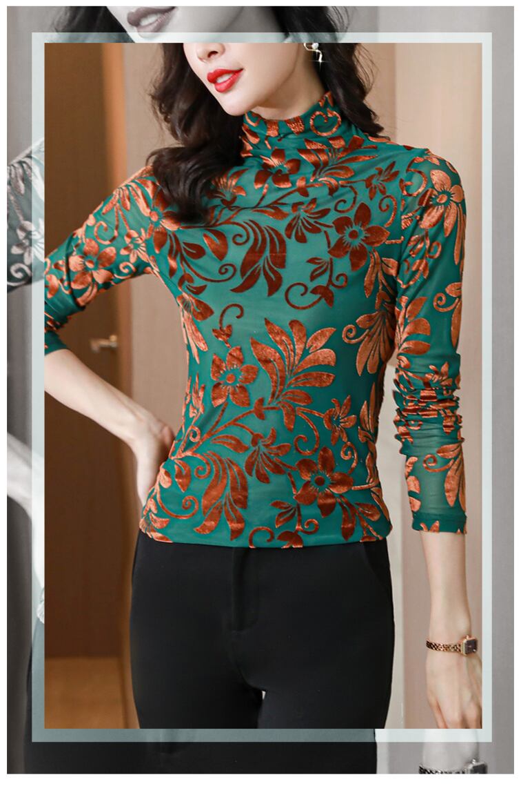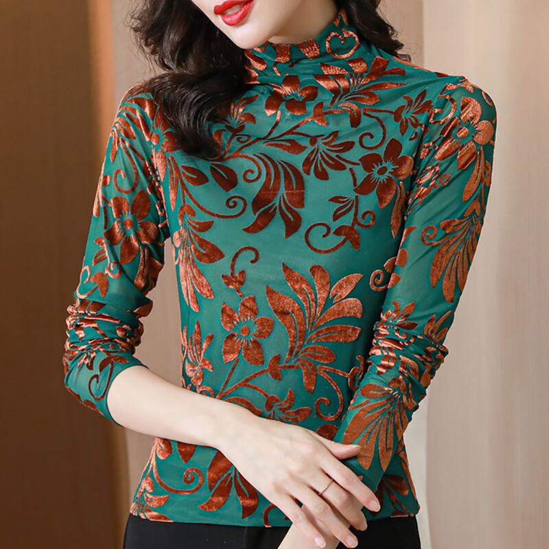 LJSXLS 2022 春の花スリム Tシャツ女性女性グリーン長袖 Tシャツタートルネック底入れトップス ロング スプリング 春物 花柄 Son43762401823