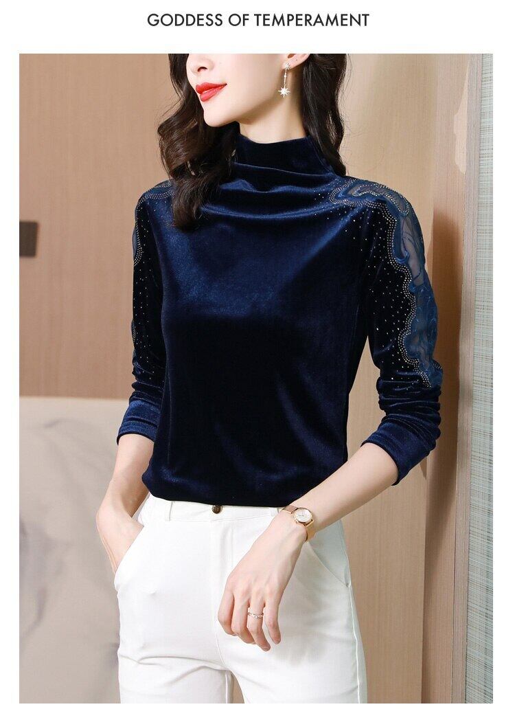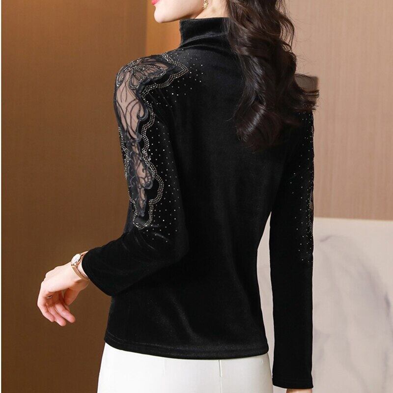 LJSXLS 長袖パッチワーク Tシャツベルベットダイヤモンド長袖底入れ Tシャツ女性 2022 春秋 Camisetas デ ロング スプリング 春物 オータム 秋物 Son56088934535