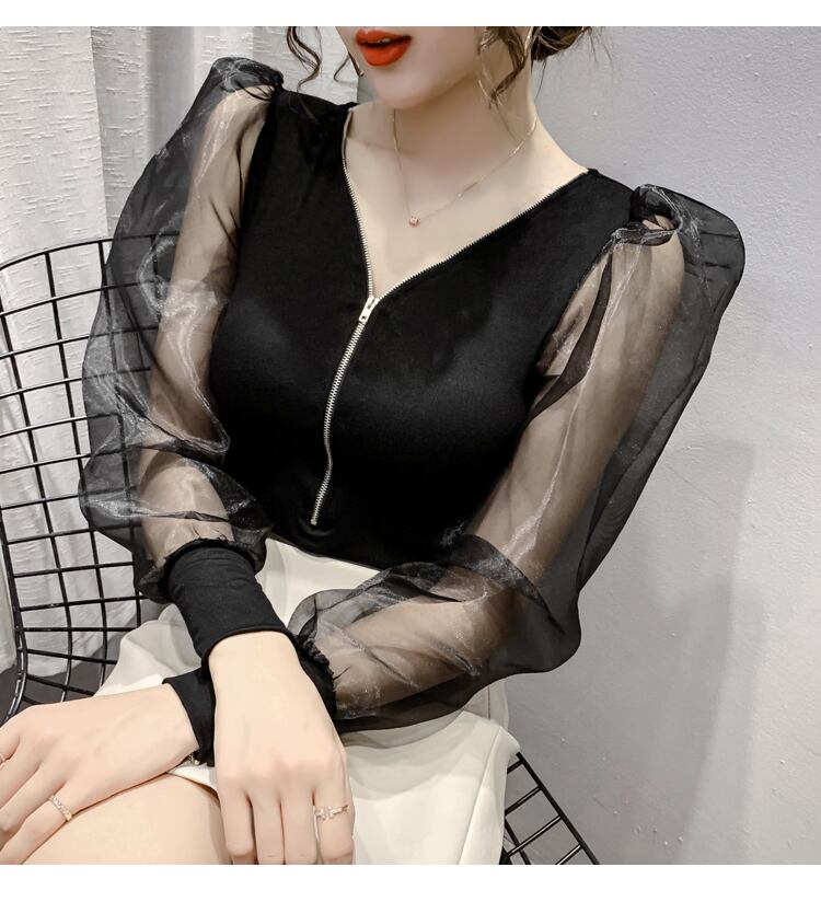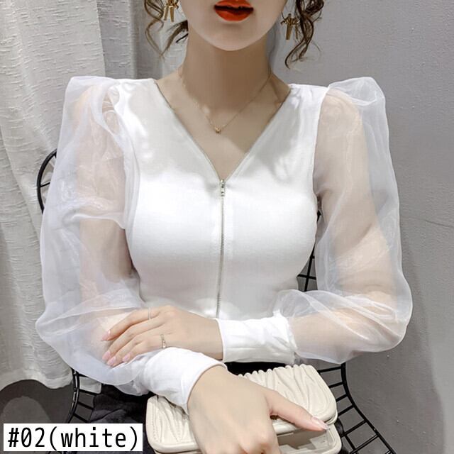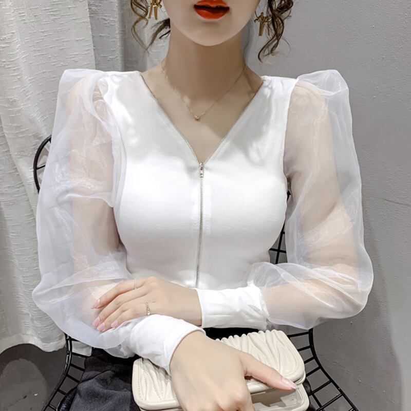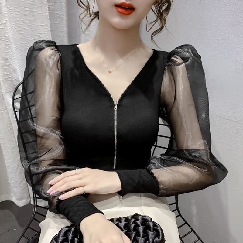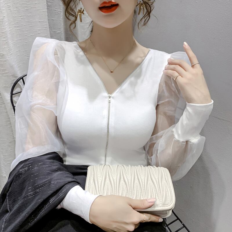 LJSXLS ガーゼパッチワークトップスセクシーな V ネック長袖 Tシャツ女性 2022 春クロップトップジッパー女性服 ロング スプリング 春物 Vネック Son8497076191
