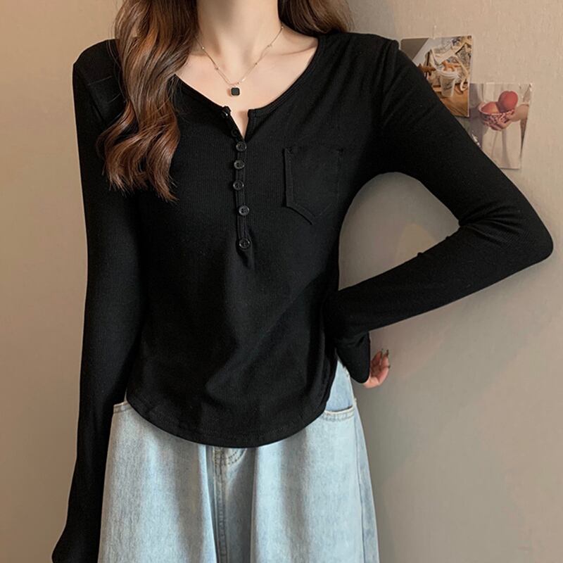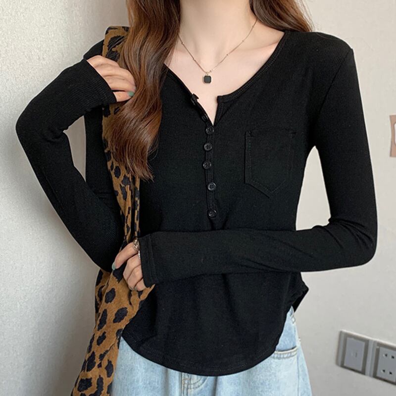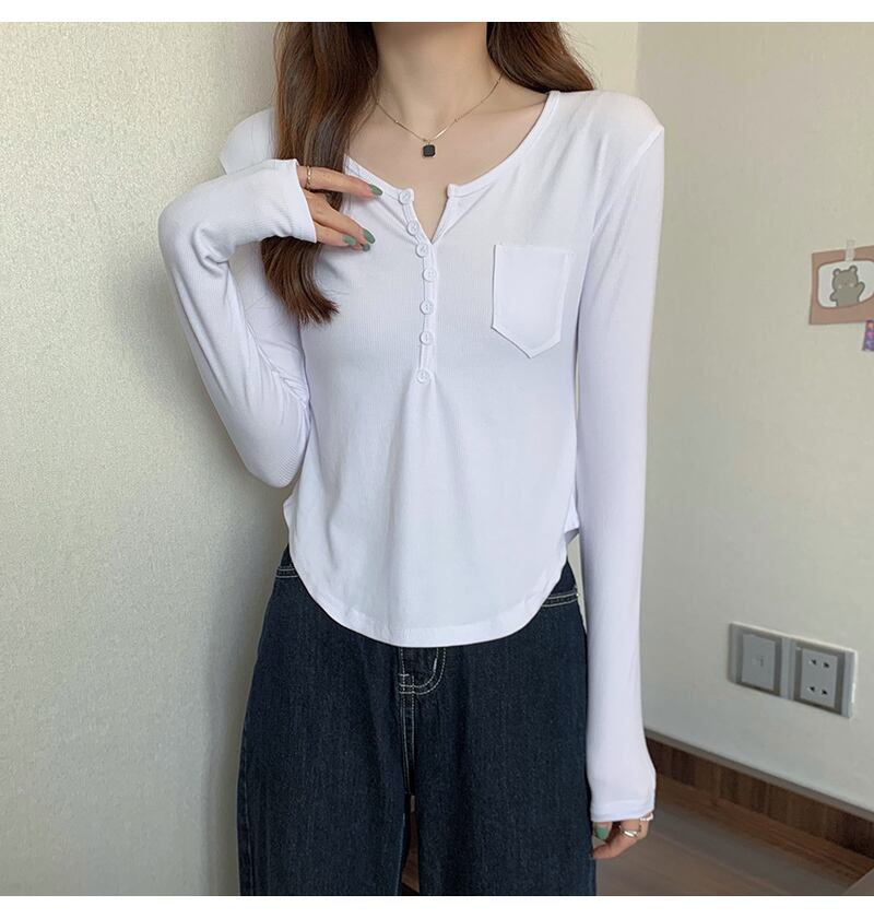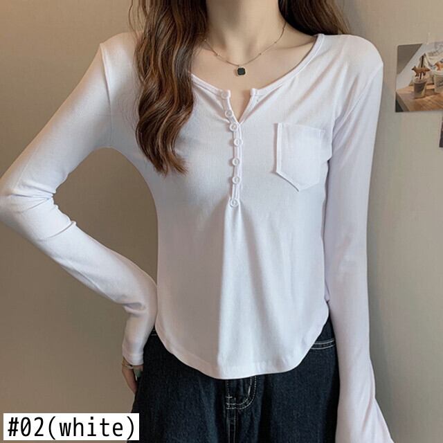 ボタン V ネック長袖スリムコットン Tシャツ女性 2022 春秋トップスポケット白 Tシャツ ロング ホワイト スプリング 春物 オータム 秋物 Vネック Son51534741347