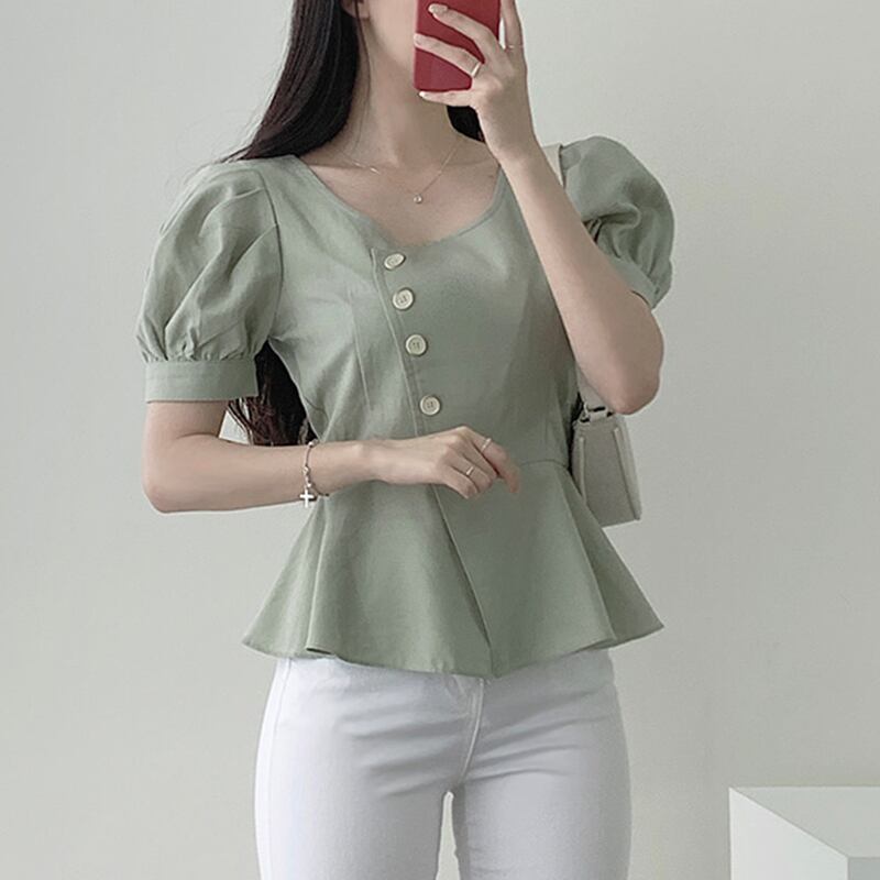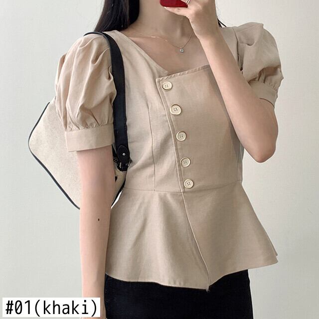 LJSXLS O ネックショート女性ブラウスボタン女性ソリッドスリムシャツ夏トップススタイルレディース 2021 サマー 夏物 Oネック ソリッドカラー Son28593402961