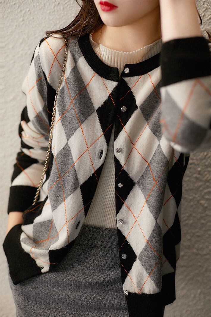 LJSXLS スタイルトップ O ネックチェック柄長袖女性ニットセーター 2022 秋冬服ボタンカーディガン ロング オータム 秋物 ウィンター 冬物 Oネック Son96637851267