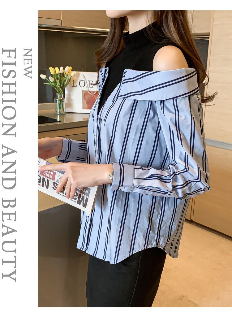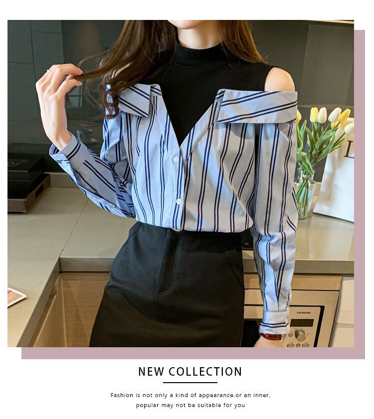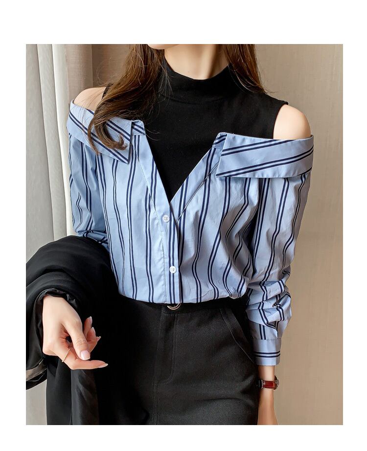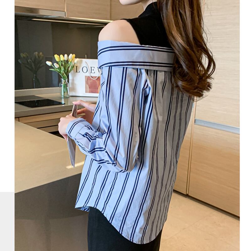 LJSXLS 春秋のセクシーなオフショルダーシャツ女性ストライプパッチワークハーフタートルネック長袖ブラウス 2022 ロング スプリング 春物 オータム 秋物 Son48238583330