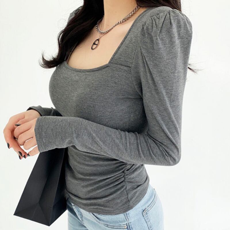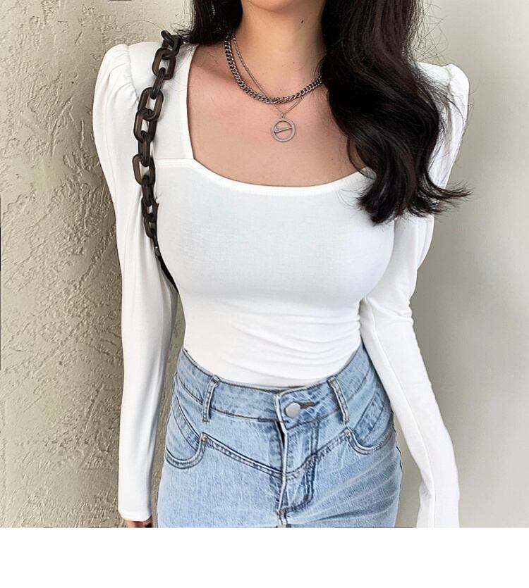 トップスセクシースリムベーシックスクエアカラー Tシャツ女性パフスリーブコットン Tシャツ春 Tシャツ スプリング 春物 スクウェア Son98213551274