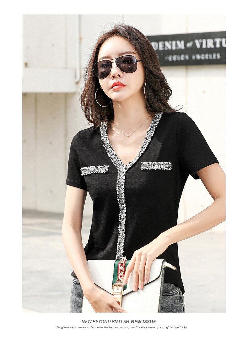 Poleras デモーダ 2022 コントラストカラー夏黒 Tシャツ女性半袖 V ネック綿白 Tシャツレディーストップス ショート ホワイト ブラック コットン ハーフスリーブ サマー 夏物 Vネック Son11908395174