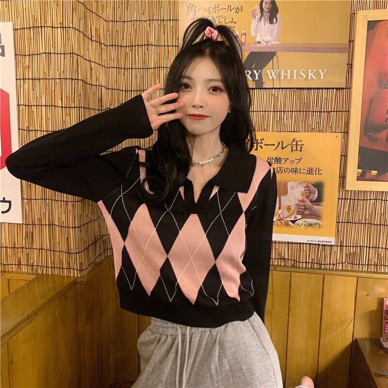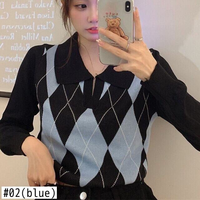 イングランドスタイル対照的な色のチェック柄長袖セーターの女性の秋のトップス 2021 冬の学生ニットプルオーバー ロング オータム 秋物 ウィンター 冬物 ヨーロピアン Son49178252550