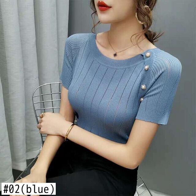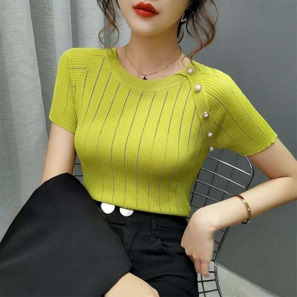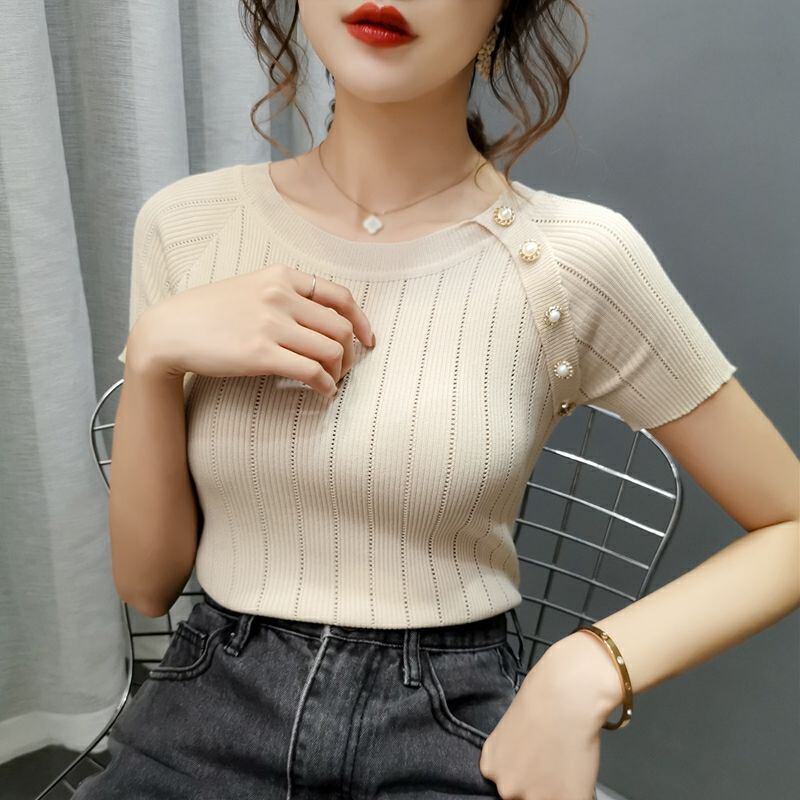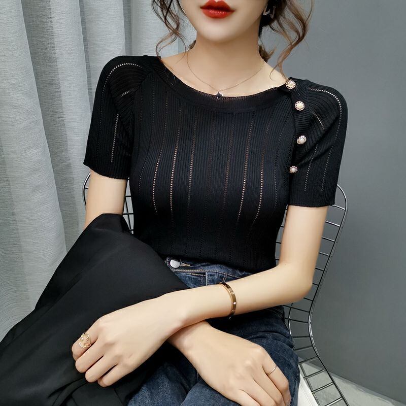 LJSXLS Tシャツニット中空アウト Tシャツボタン半袖 Tシャツ女性 2021 夏薄い白 Tシャツ ショート ホワイト ハーフスリーブ サマー 夏物 Son44896872212