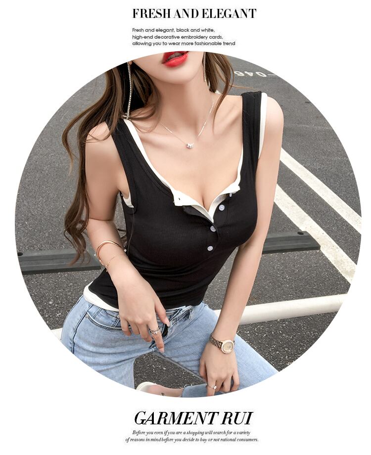 夏 2022 フェイクツーピースタンクトップ女性黒ボタンセクシーな V ネックトップスタンクベストノースリーブコットン白人女性服 ホワイト ブラック サマー 夏物 Vネック Son20264980143