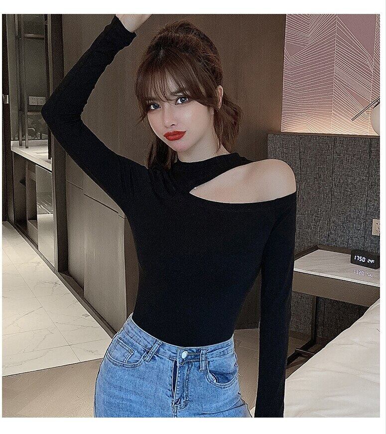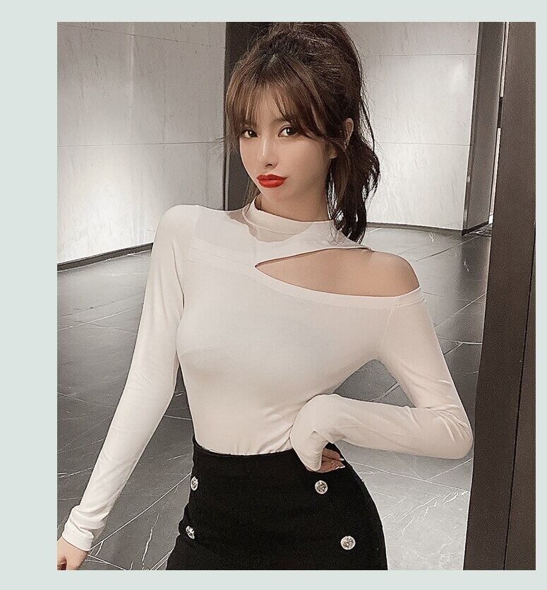 LJSXLS 2021 春の女性の綿中空アウト女性 Tシャツ長袖 Tシャツセクシーなオフショルダートップス黒、白 ロング ホワイト ブラック コットン スプリング 春物 Son30950774105