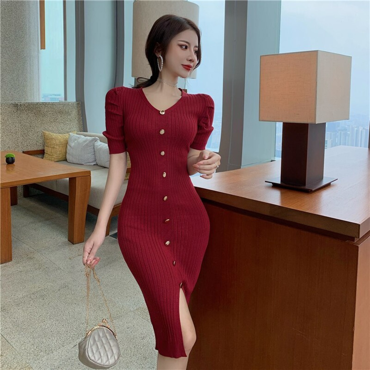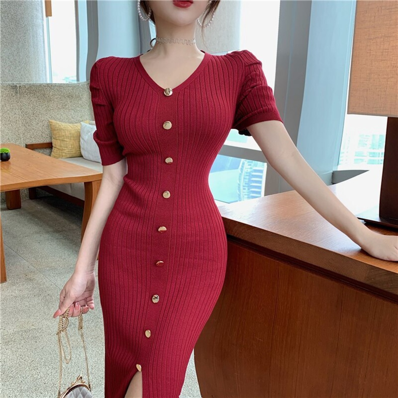 LJSXLS セクシーな V ネック弾性シングルブレストスリットミディ丈ドレス女性ボディコンニットドレス 2022 夏 エラスティック 伸縮 サマー 夏物 Vネック Son63126385024