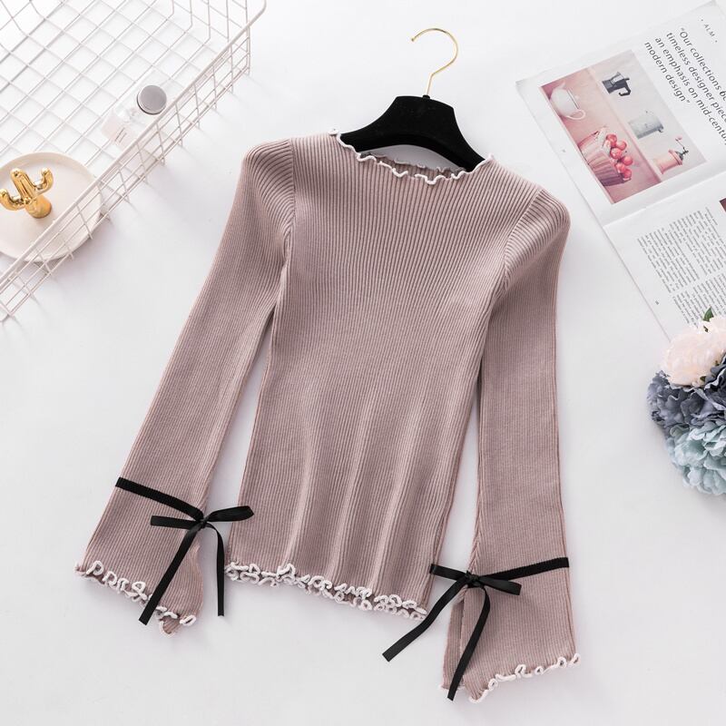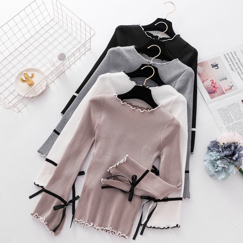 LJSXLS プル 2021 秋冬固体プルオーバースリムフレア長袖セーター女性スリット弓ニットセーター ロング リボン オータム 秋物 ウィンター 冬物 ソリッドカラー Son45493683469