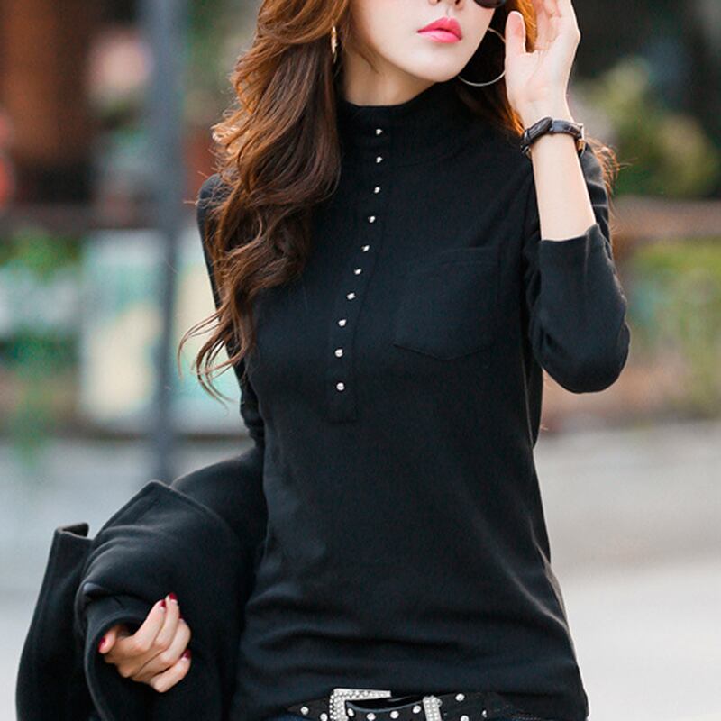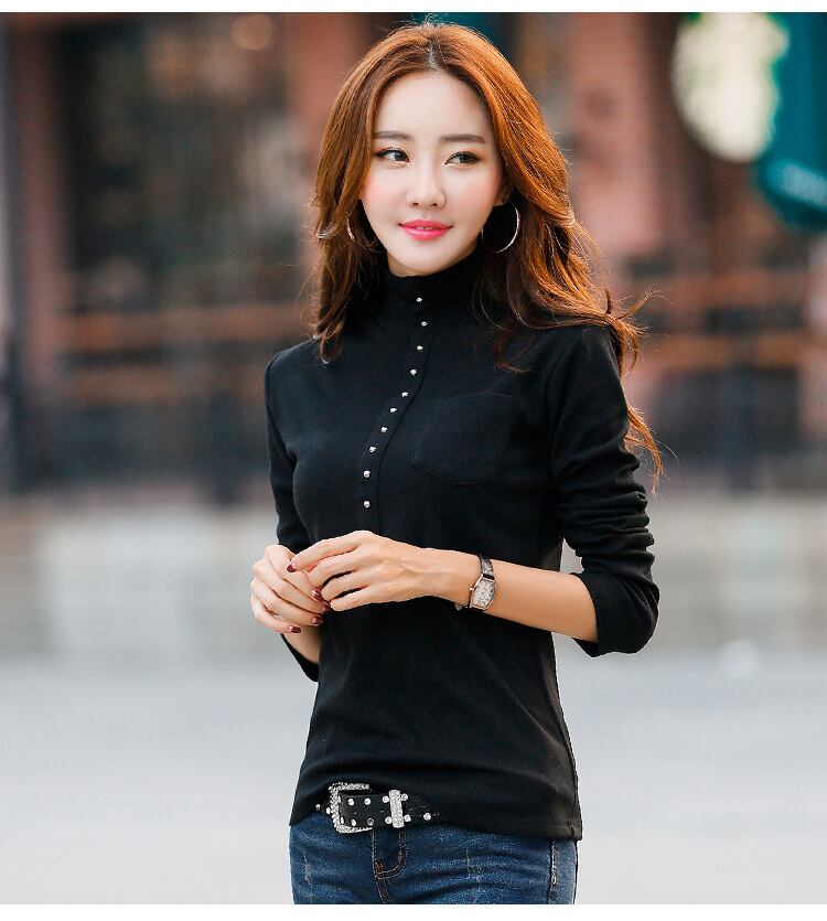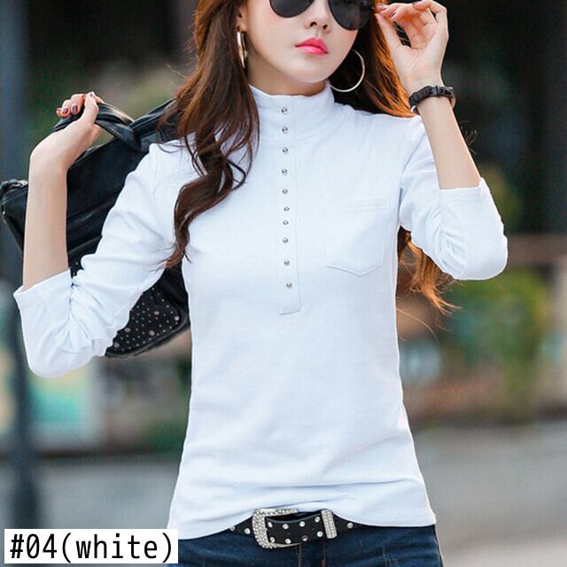 LJSXLS 女性の綿白 Tシャツ秋スリム服リベット長袖タートルネック Tシャツ 2021 冬トップ ロング ホワイト コットン オータム 秋物 ウィンター 冬物 Son88106488273