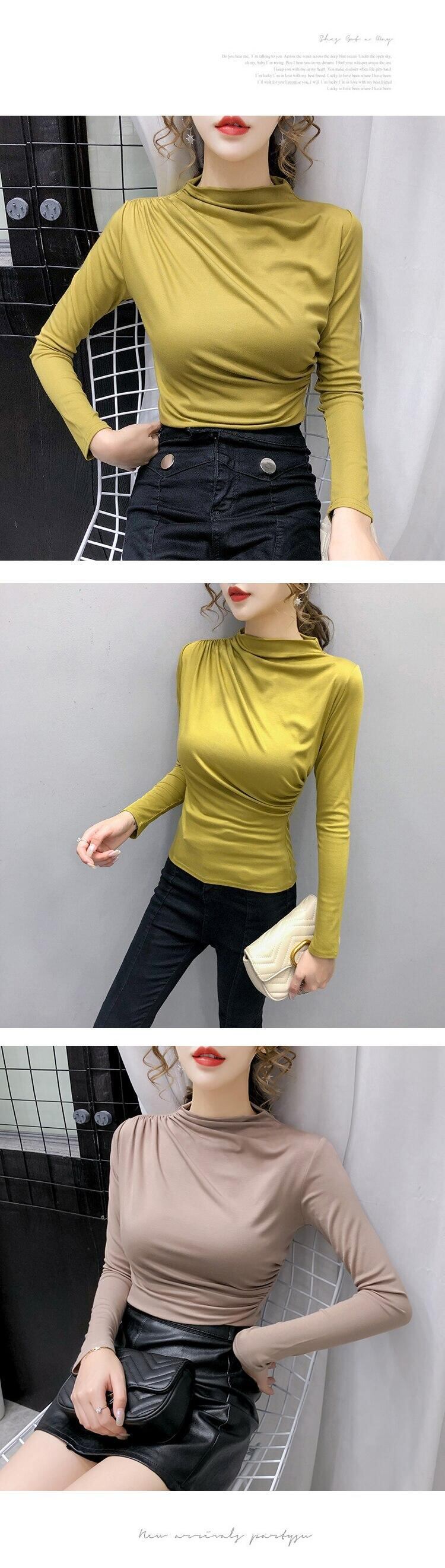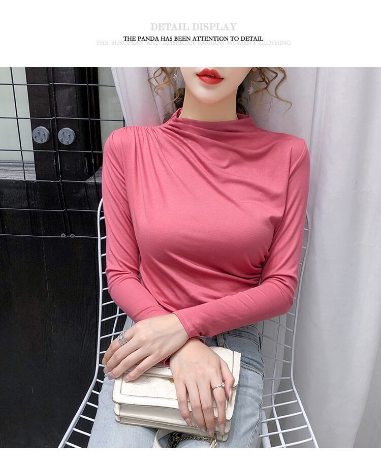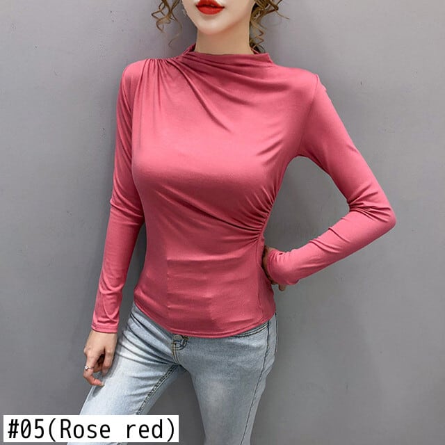 秋黒綿の女性の Tシャツ無地スタンドカラー長袖 Tシャツスキニー Tシャツスリムトップ ロング ブラック コットン オータム 秋物 ソリッドカラー Son80110014528