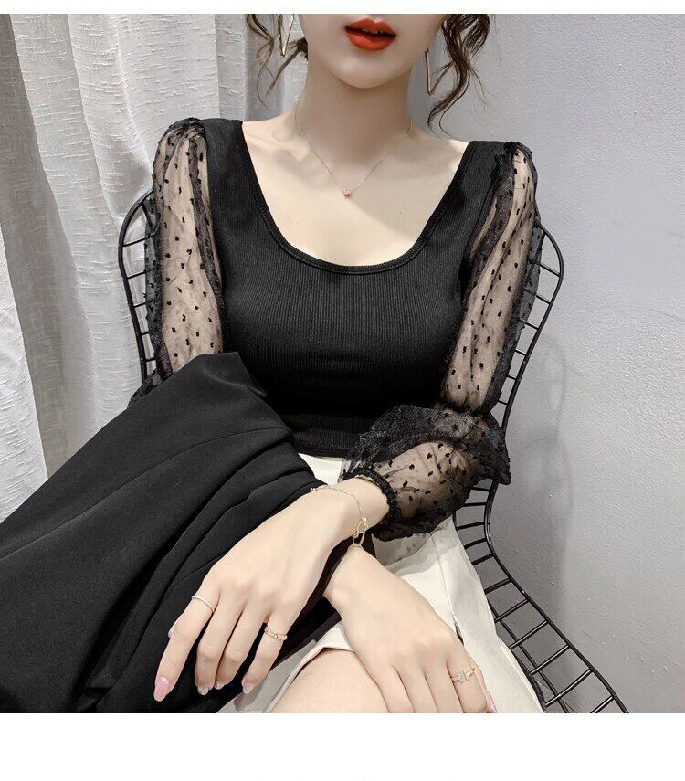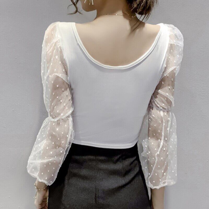 2022 春クロップトップガーゼパッチワークトップスセクシーなスリム長袖 Tシャツ女性女性服 Tshits ロング スプリング 春物 Son13770903080