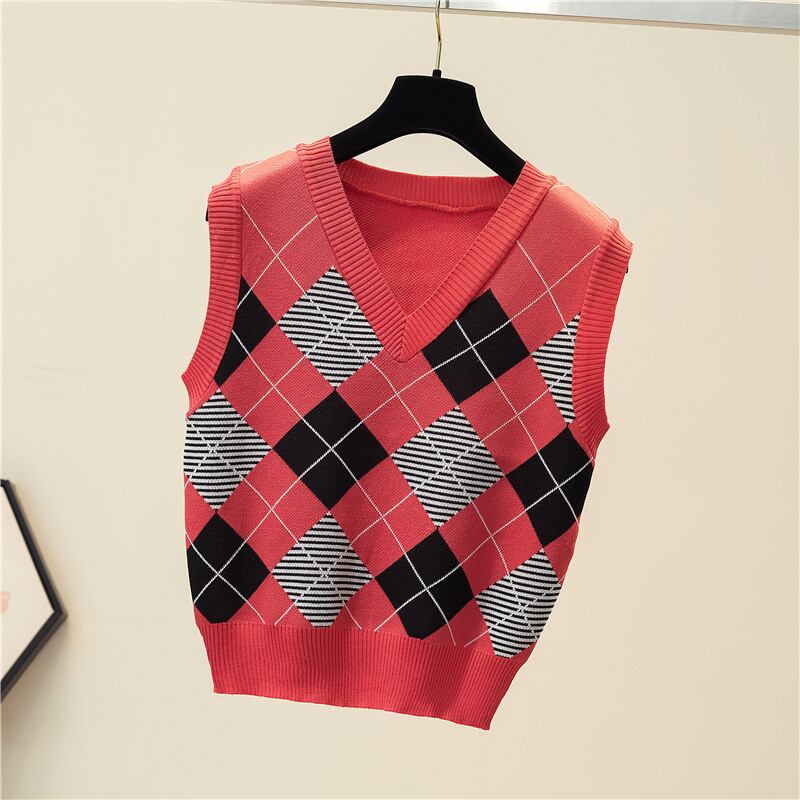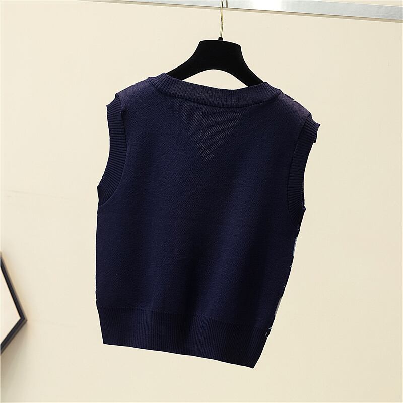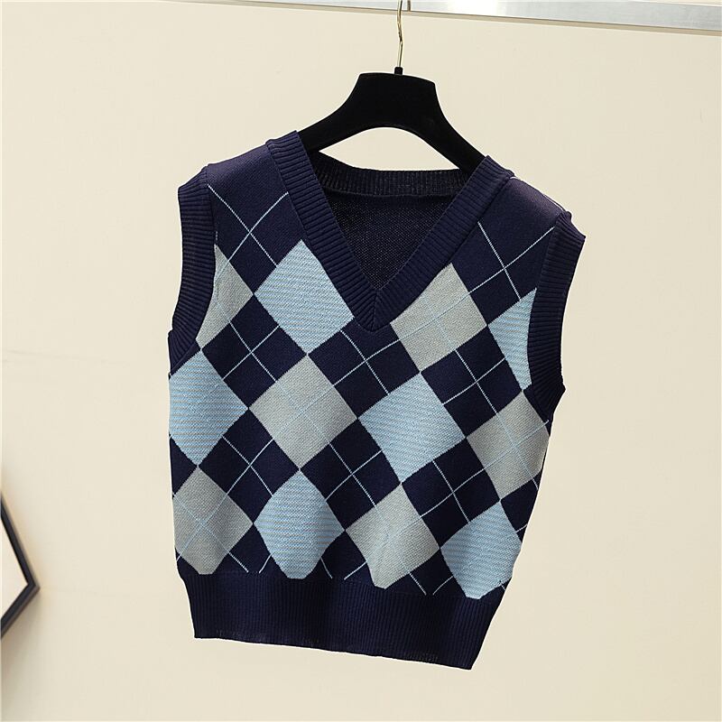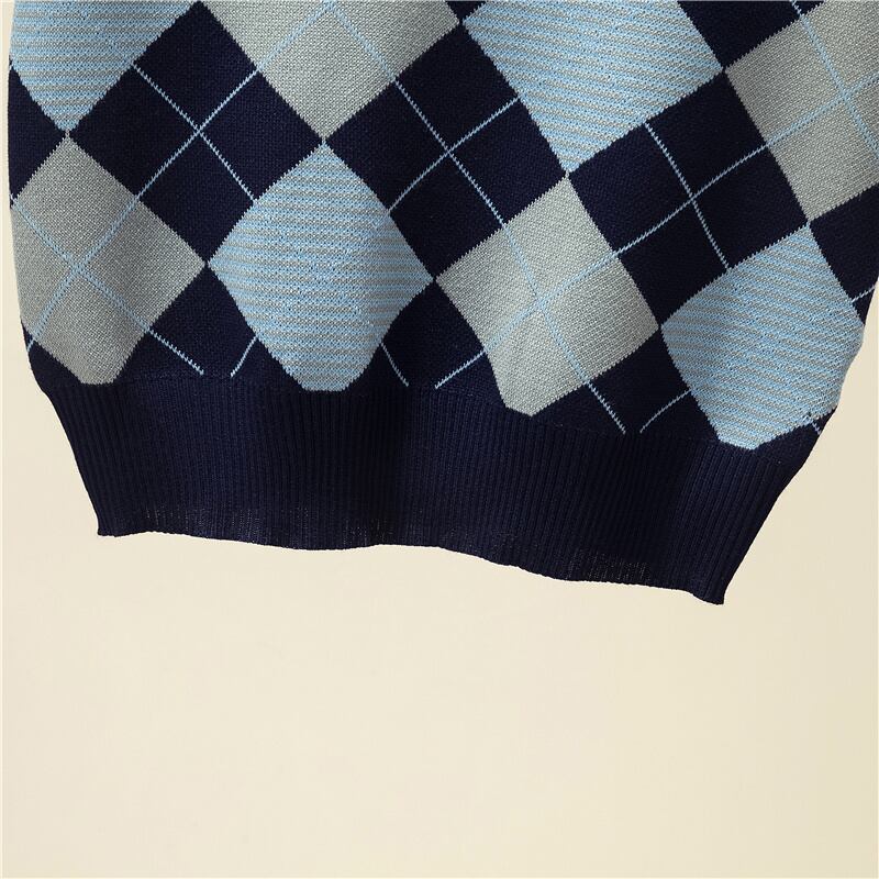 LJSXLS V ネック女性秋イングランドスタイルニットベスト夏 2022 ノースリーブブルーチェック柄セータープルオーバークロップトップ サマー 夏物 オータム 秋物 Vネック ヨーロピアン Son58516904902
