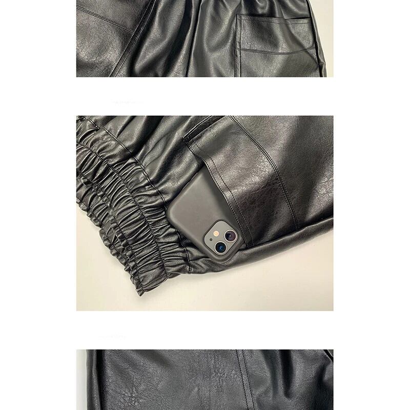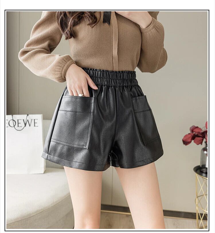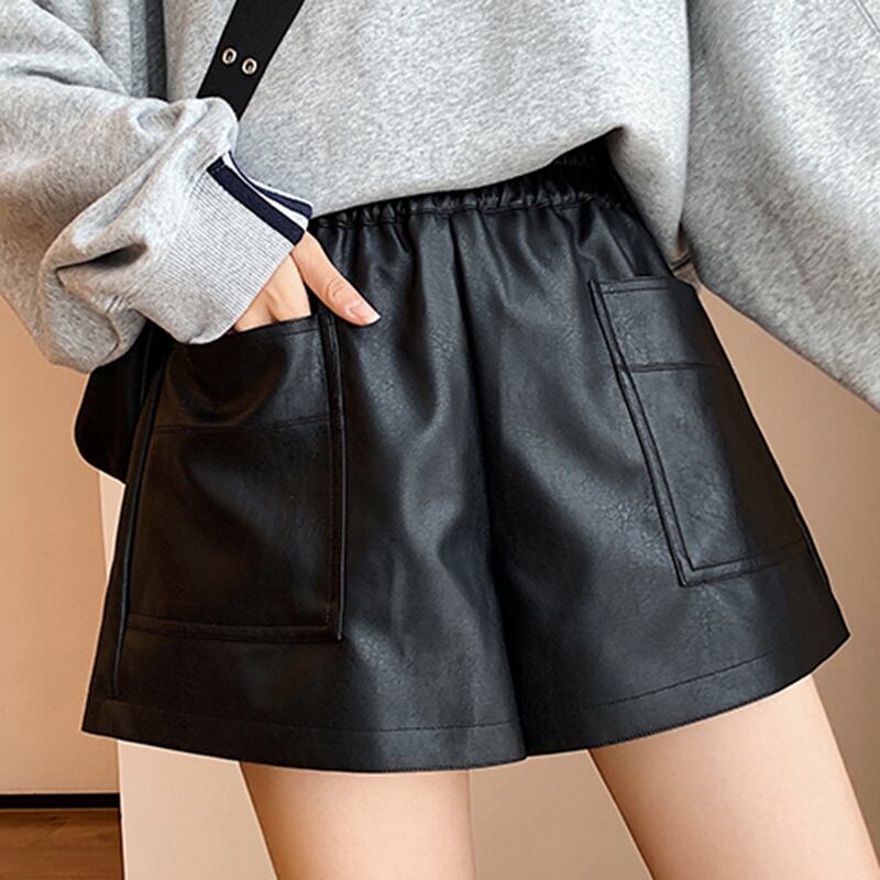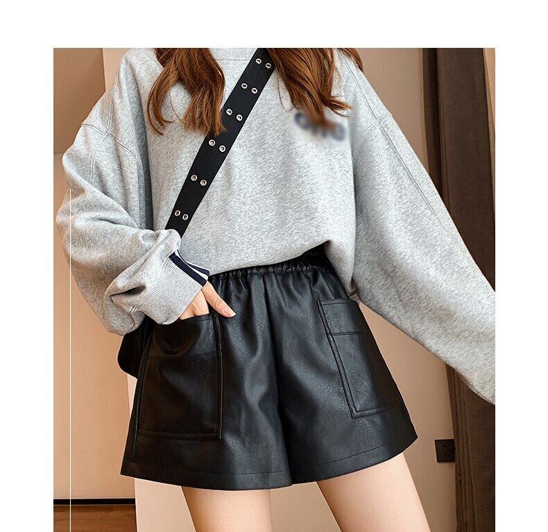 LJSXLS 秋 A ライン PU レザーショーツ女性 2021 ルーズワイドレッグ冬ウエスト黒ショーツ Pantalones Cortos ブラック オータム 秋物 ウィンター 冬物 ブルマー Aライン ワイドパンツ Son18035084793