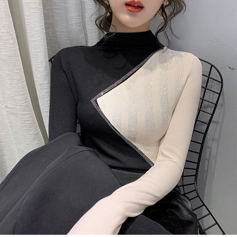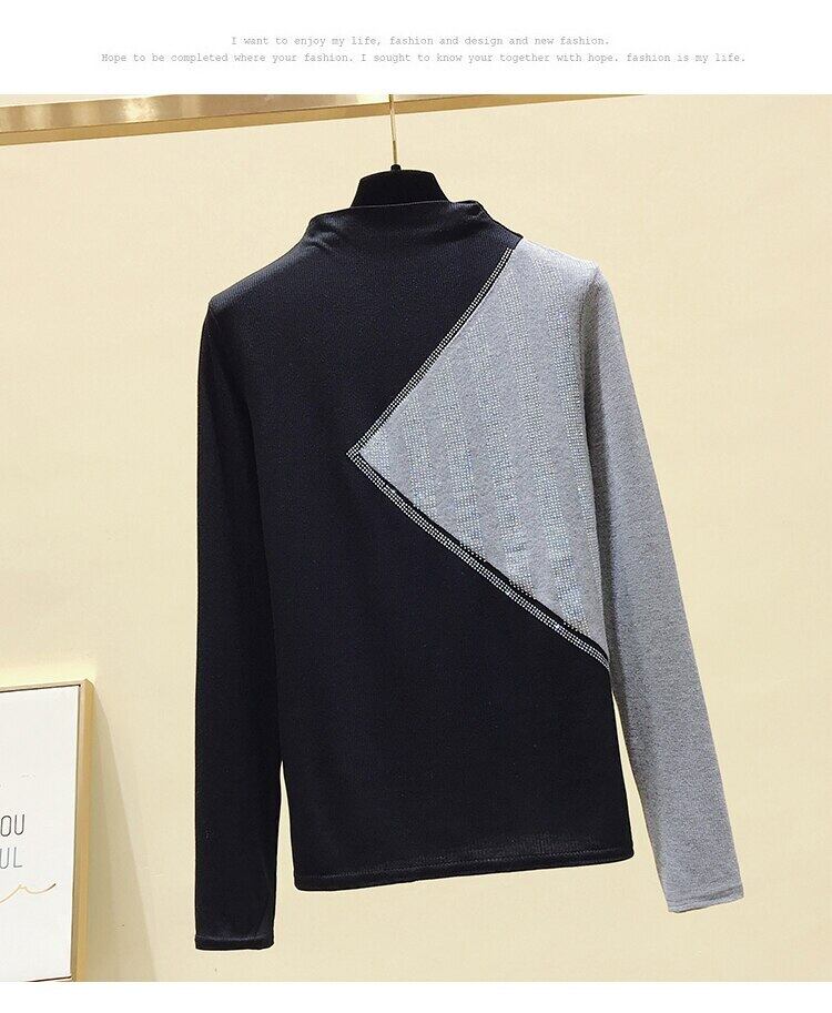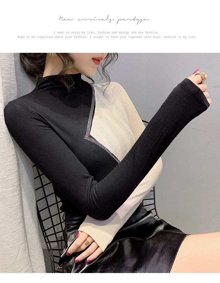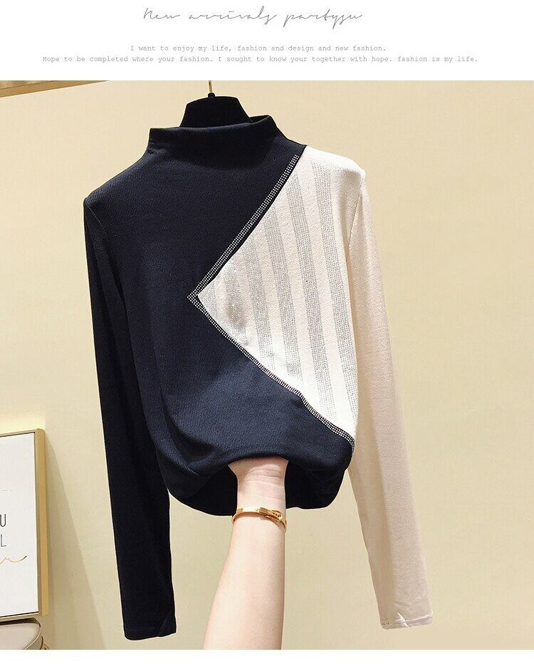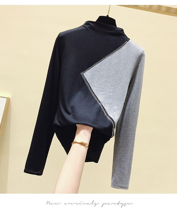 秋のハーフカラー長袖女性の Tシャツコントラストカラーダイヤモンド Tシャツスリムコットントップス女性 2021 ロング オータム 秋物 Son93929894116