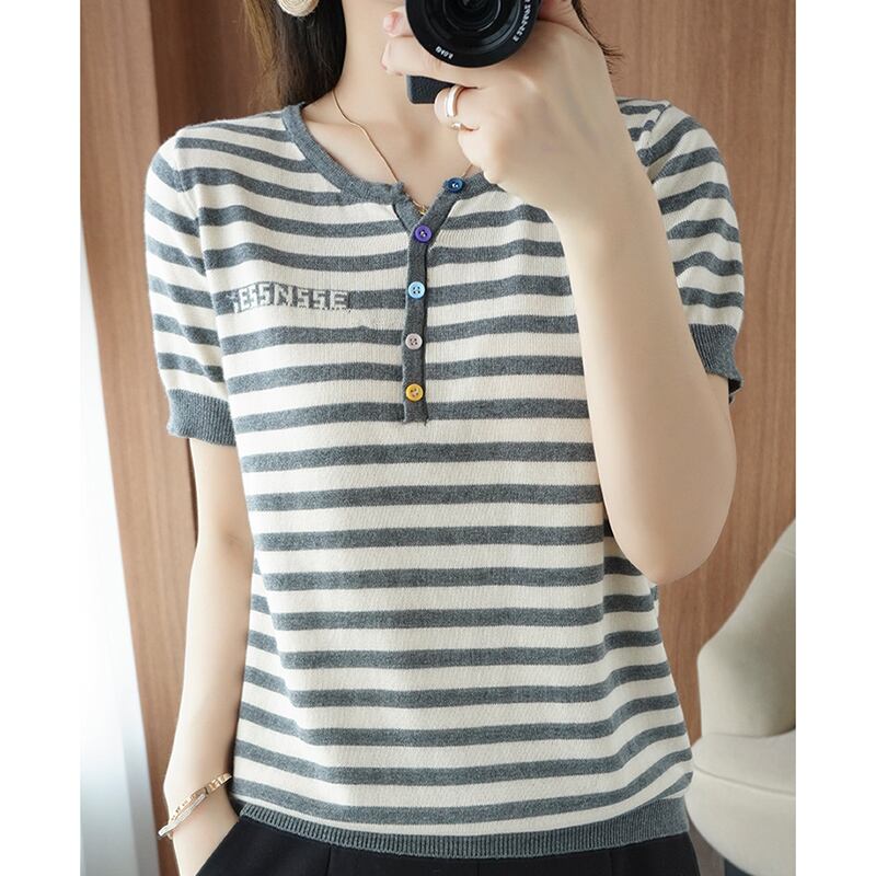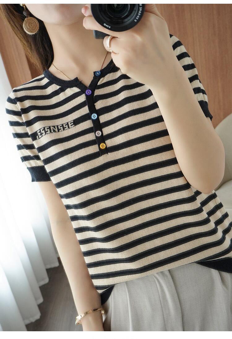 ニット半袖 Tシャツボタンストライプ刺繍手紙女性薄型 O ネック Tシャツフェミニン 2022 夏ルーズアイスシルクトップス ショート ハーフスリーブ サマー 夏物 Oネック Son39007920316