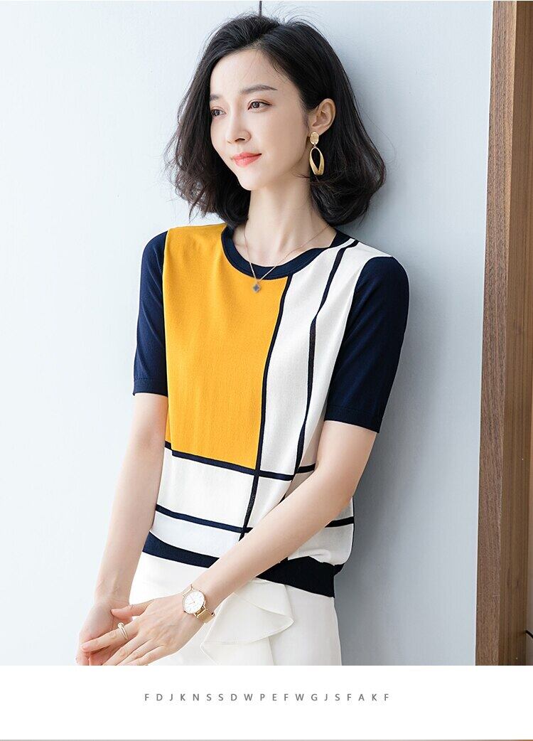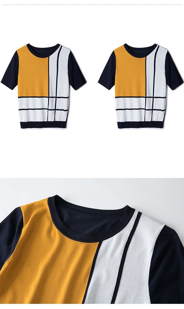 LJSXLS ニット半袖 Tシャツ女性の夏のトップ 2021 服ゆるいパッチワーク弾性 Tシャツ ショート ハーフスリーブ エラスティック 伸縮 サマー 夏物 Son65748499306