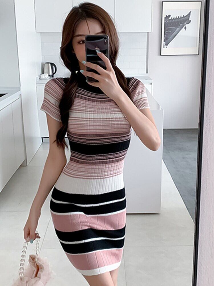 LJSXLS サマードレス女性ストライプ半袖 O ネックドレス女性服 2022 ニット弾性黒ドレス ショート ブラック ハーフスリーブ エラスティック 伸縮 夏物 Oネック Son30172081773