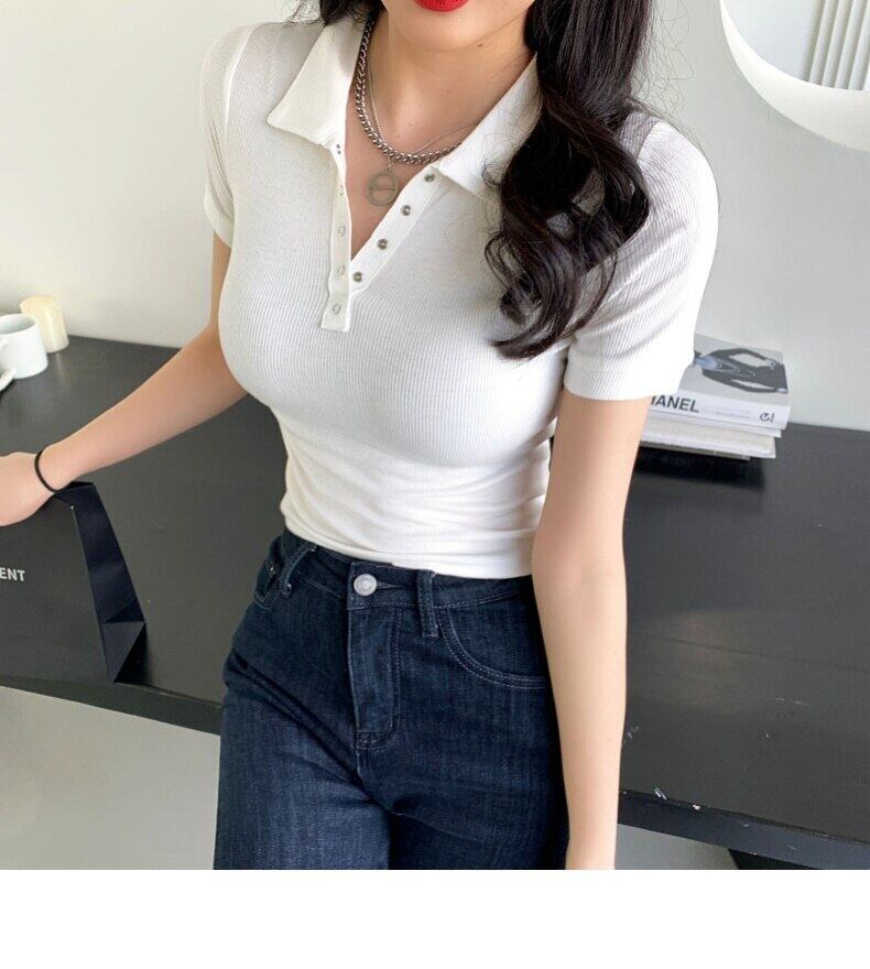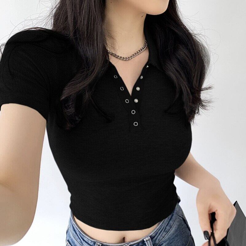 LJSXLS ストリートターンダウン襟コットン Tシャツ女性のセクシーなクロップトップススリム Tシャツ白黒 Tシャツ 2021 夏服 ホワイト ブラック サマー 夏物 Son42353644163