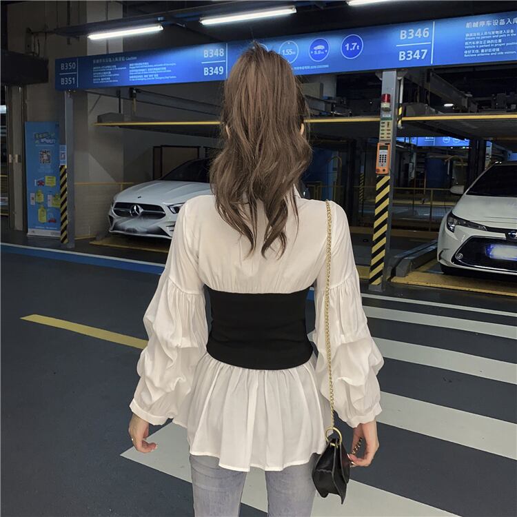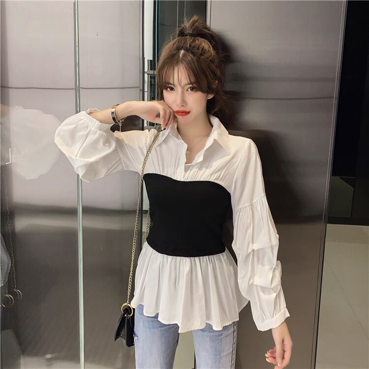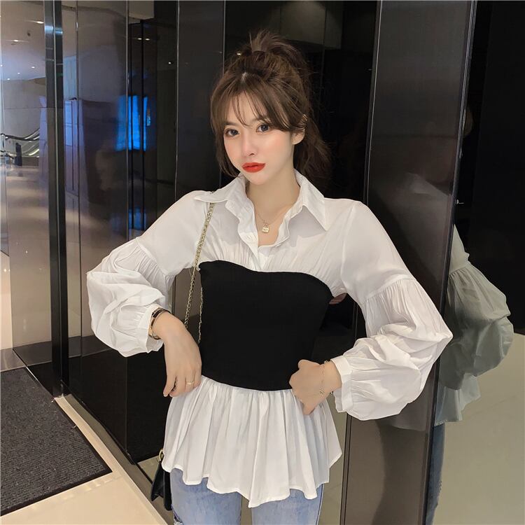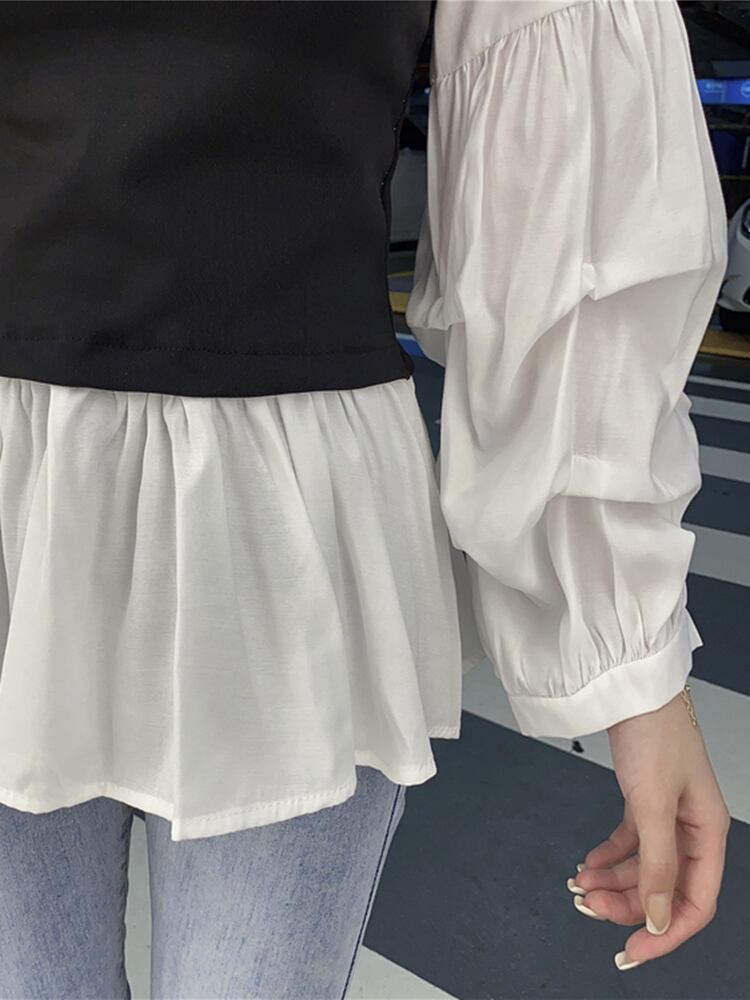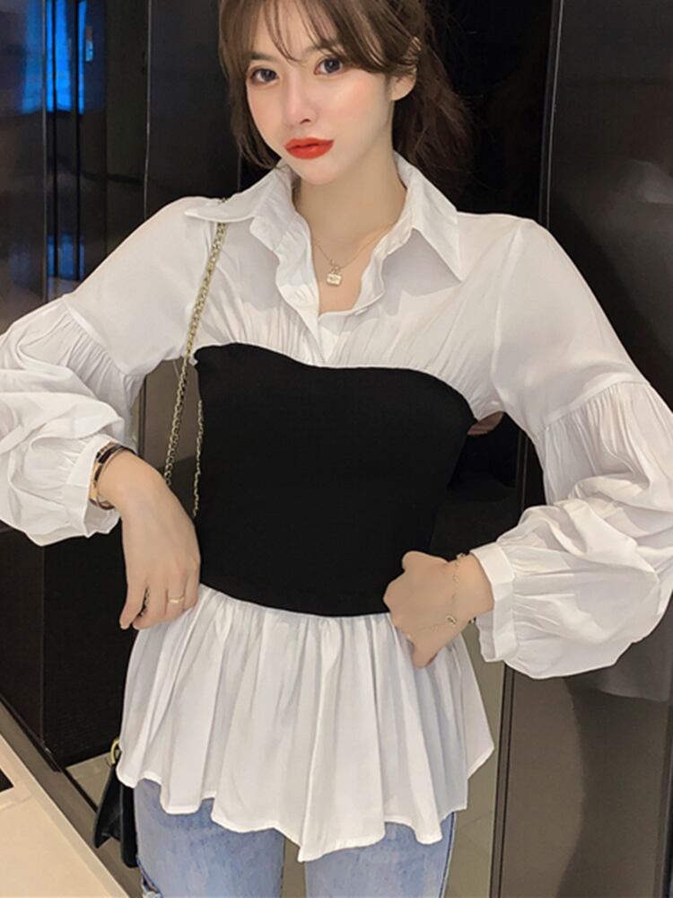 デモーダ 2022 秋パッチワークブラウス女性長袖フェイク二枚トップスリムシャツ服 ロング オータム 秋物 Son74699278632