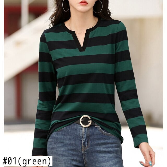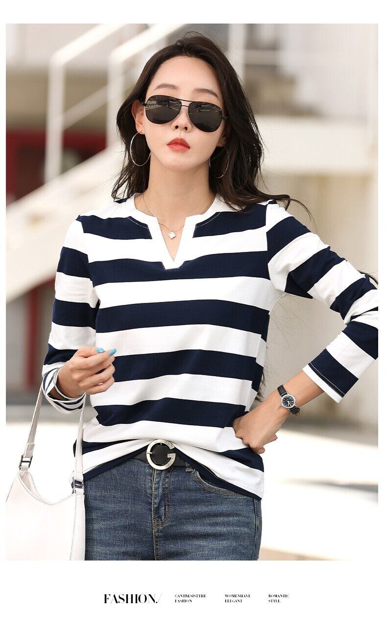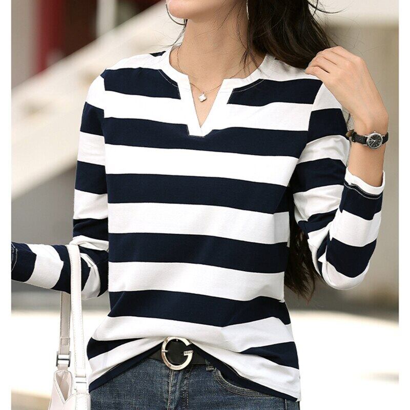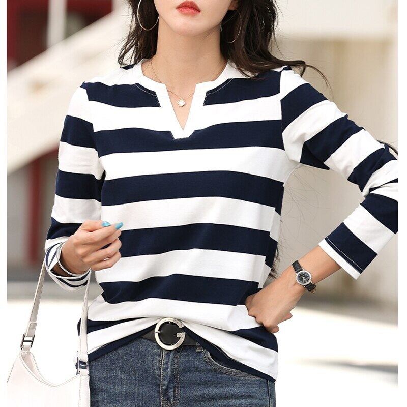 LJSXLS Tシャツ女性 V ネックストライプ Poleras 長袖スリムコットントップ 2022 春秋の女性 ロング スプリング 春物 オータム 秋物 Vネック Son80386691808