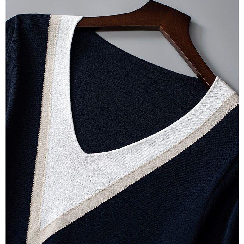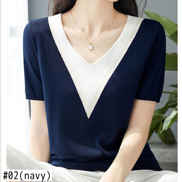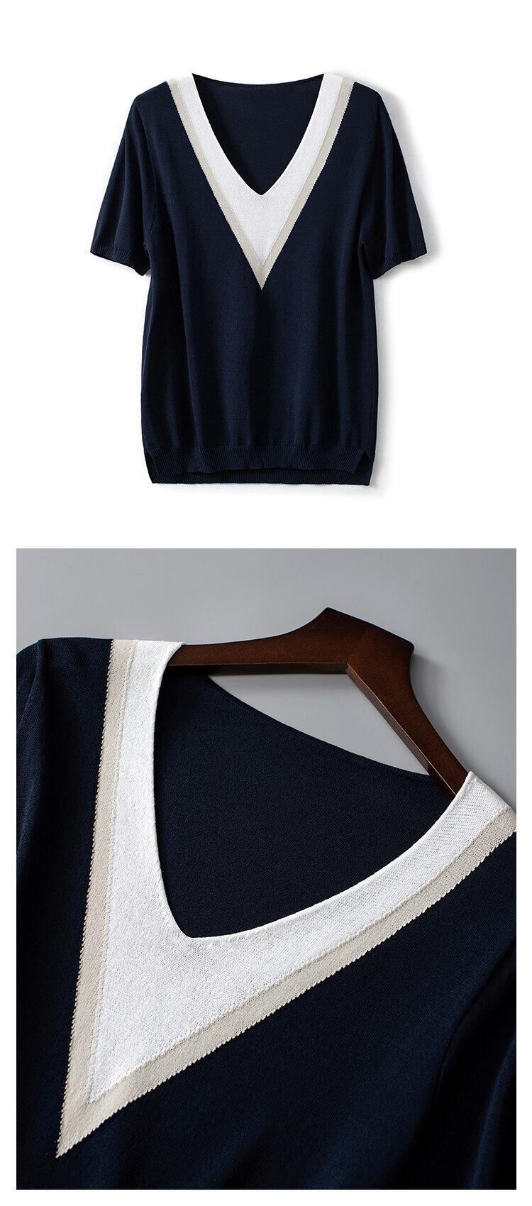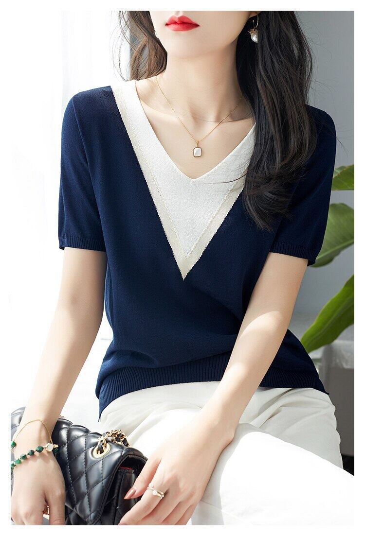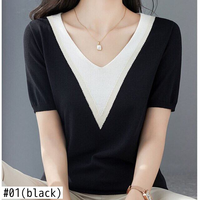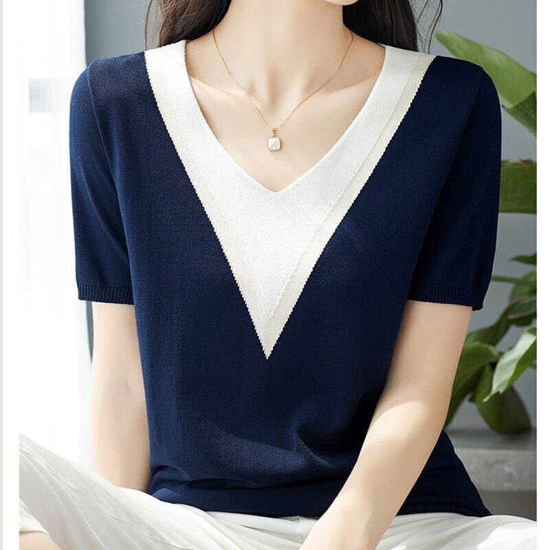 Poleras V ネック Tシャツ女性コントラストカラートップニット半袖 Tシャツ 2022 夏の女性 Tシャツ ショート ハーフスリーブ サマー 夏物 Vネック Son52917059731