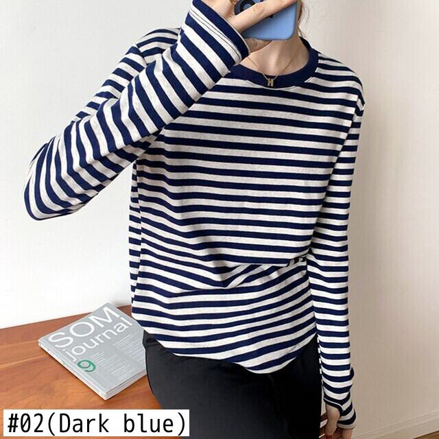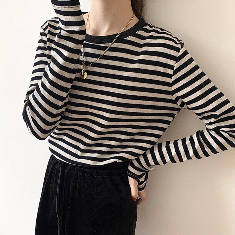 ストライプ O ネック Tシャツレディースコットン長袖 Tシャツ春秋ルーズブラックトップス女性 2021 スタイル Tシャツ ロング スプリング 春物 オータム 秋物 Oネック Son70865057977