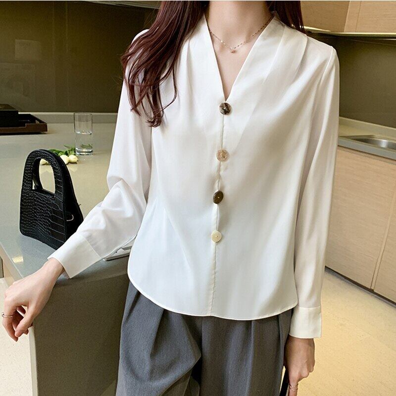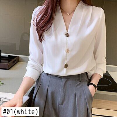 LJSXLS レディース服 2021 春 V ネックシフォンブラウス女性長袖白シャツ秋の女性 ロング ホワイト スプリング 春物 Vネック Son3743733779