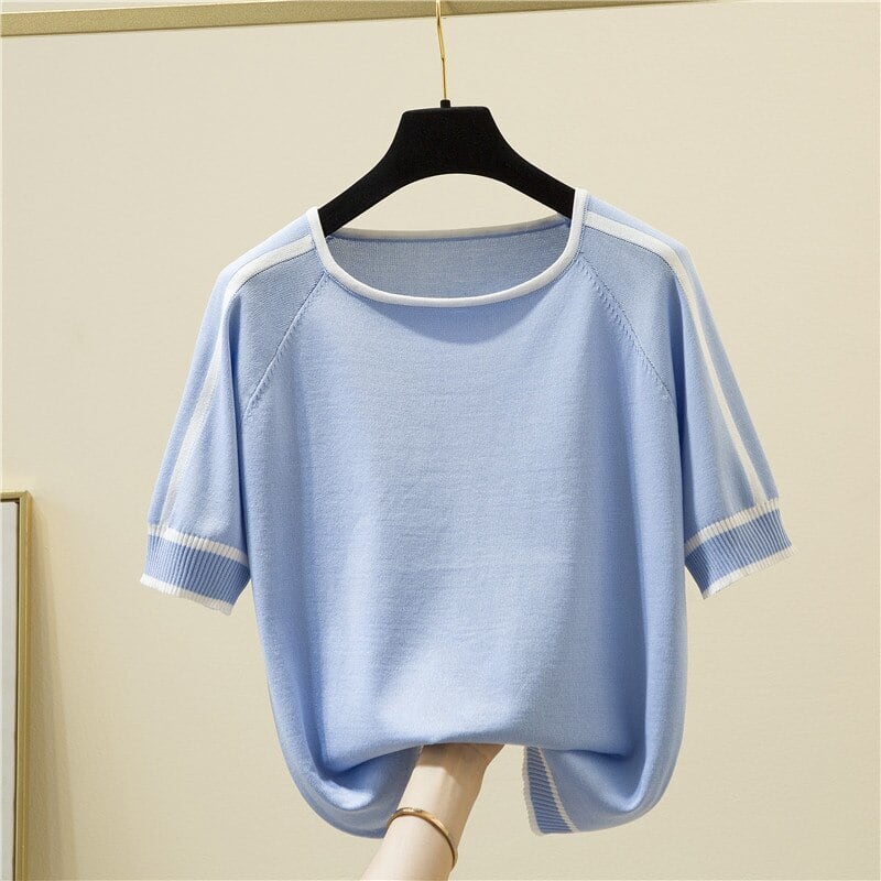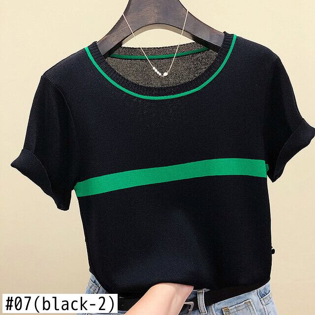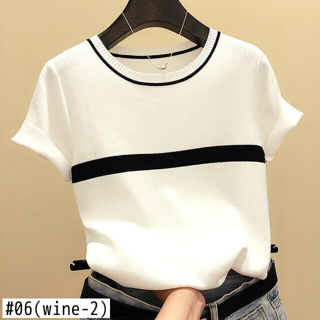Tシャツ薄いニット Tシャツ女性半袖 Tシャツ夏トップス女性服ストライプ Tシャツ Camisetas ショート ハーフスリーブ サマー 夏物 Son70018453529