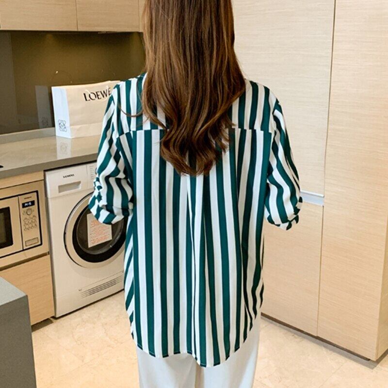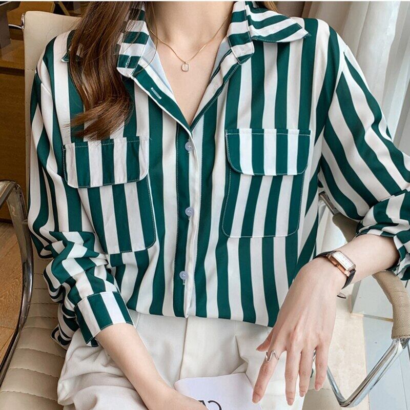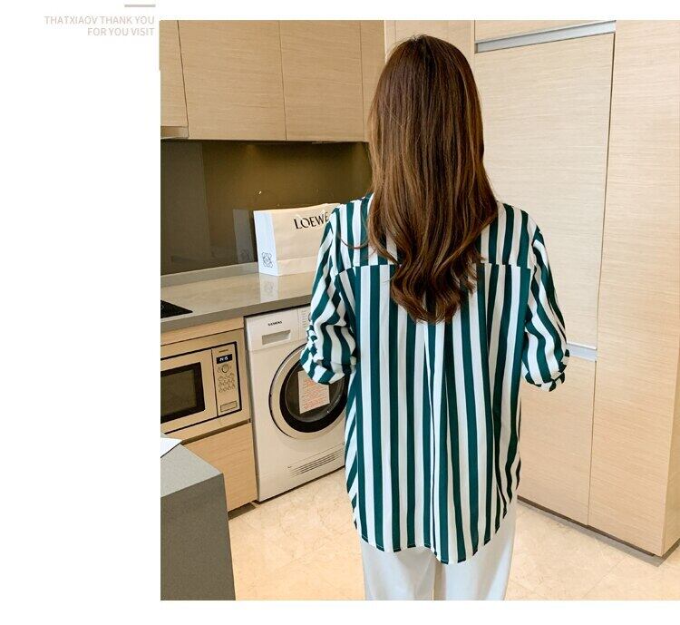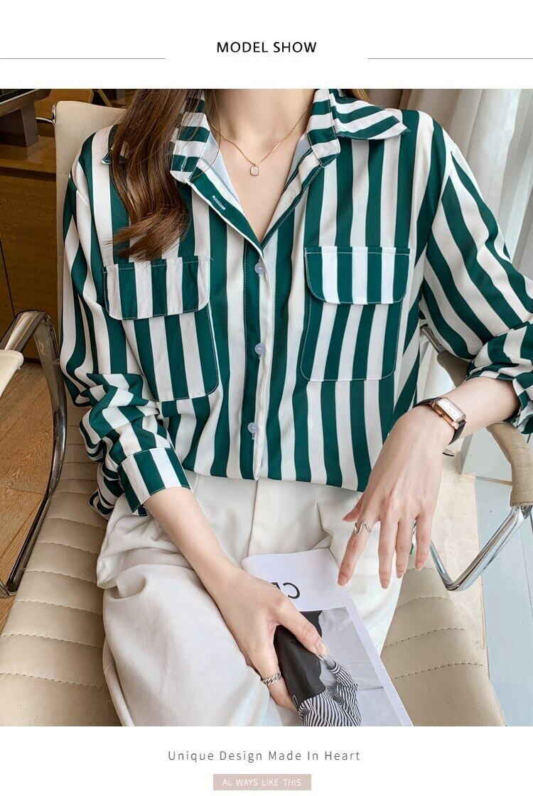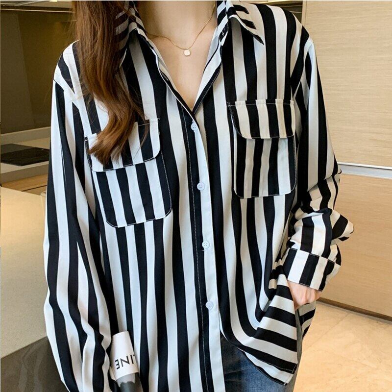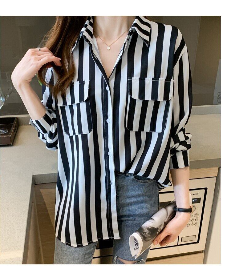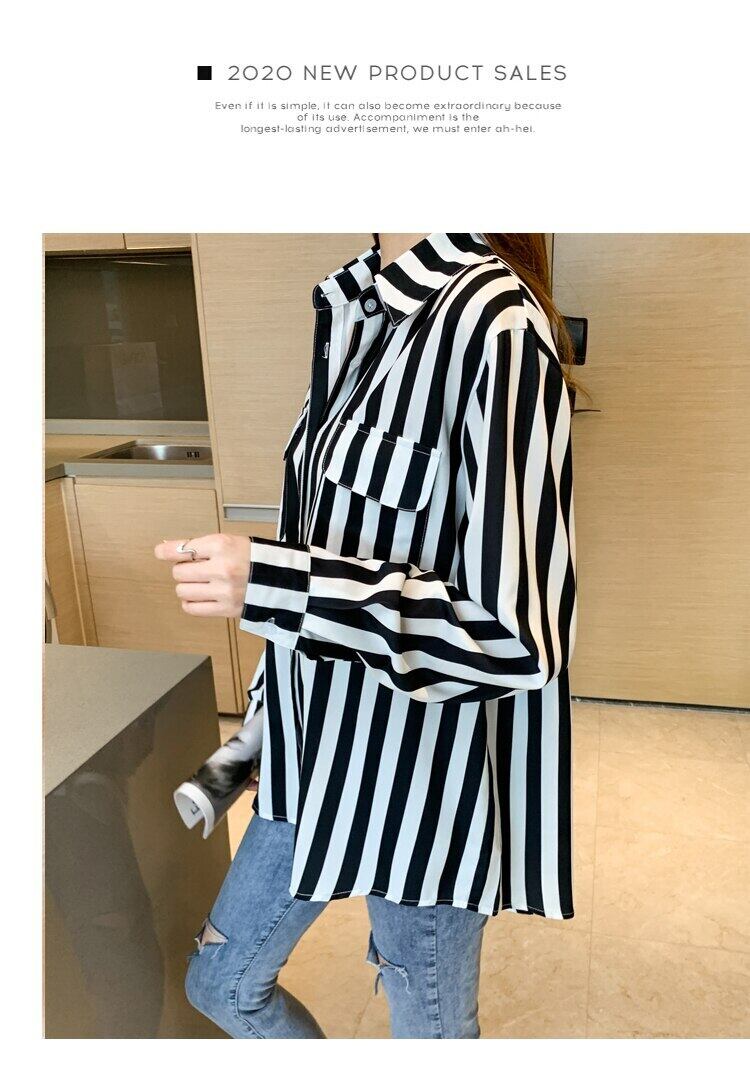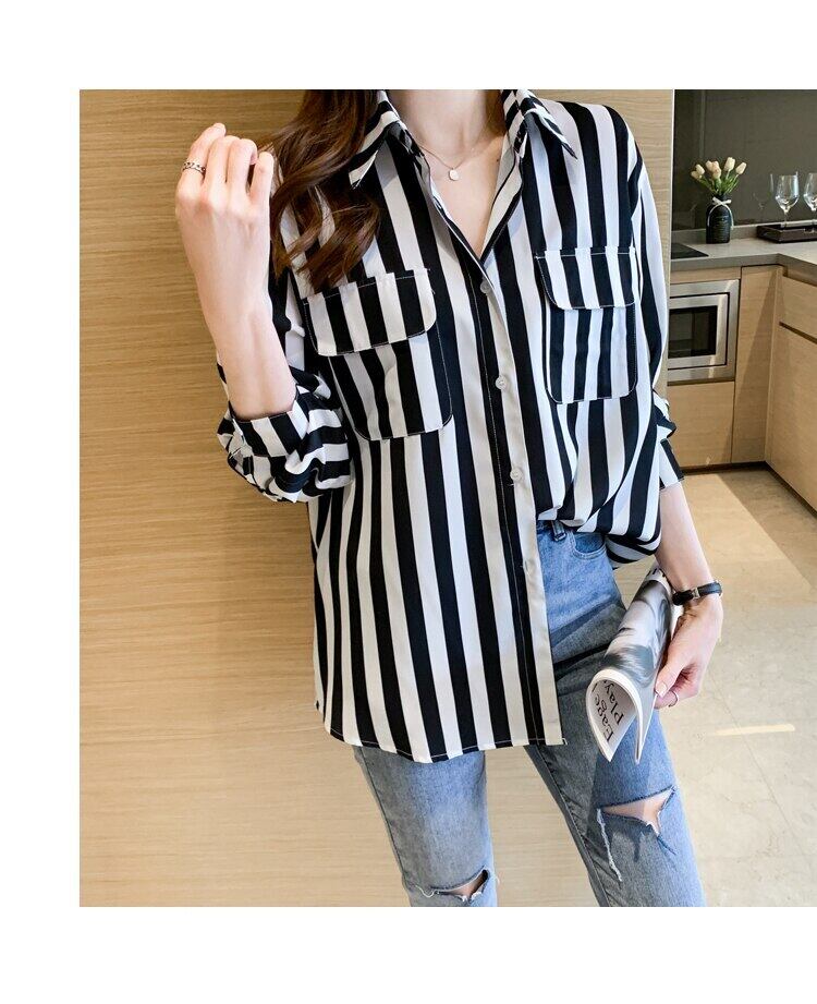 白黒ストライプ春秋シフォンブラウス長袖ルーズブラウス女性シャツポケットトップス女性服 ロング ホワイト ブラック スプリング 春物 オータム 秋物 Son85565578043