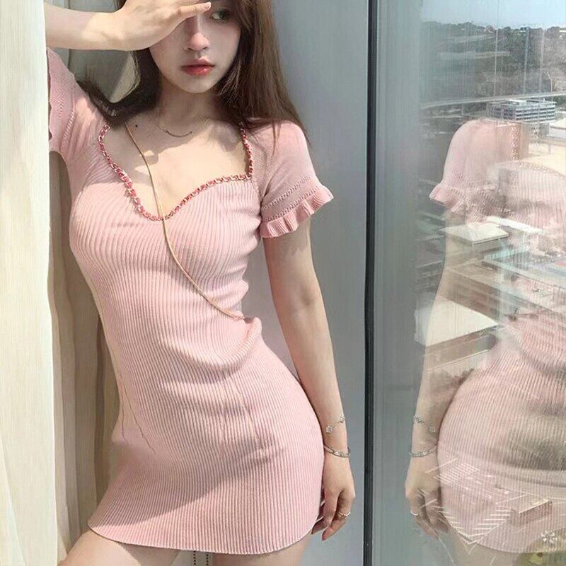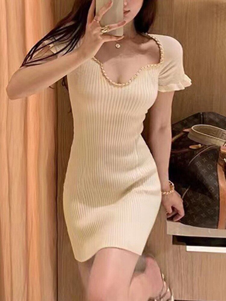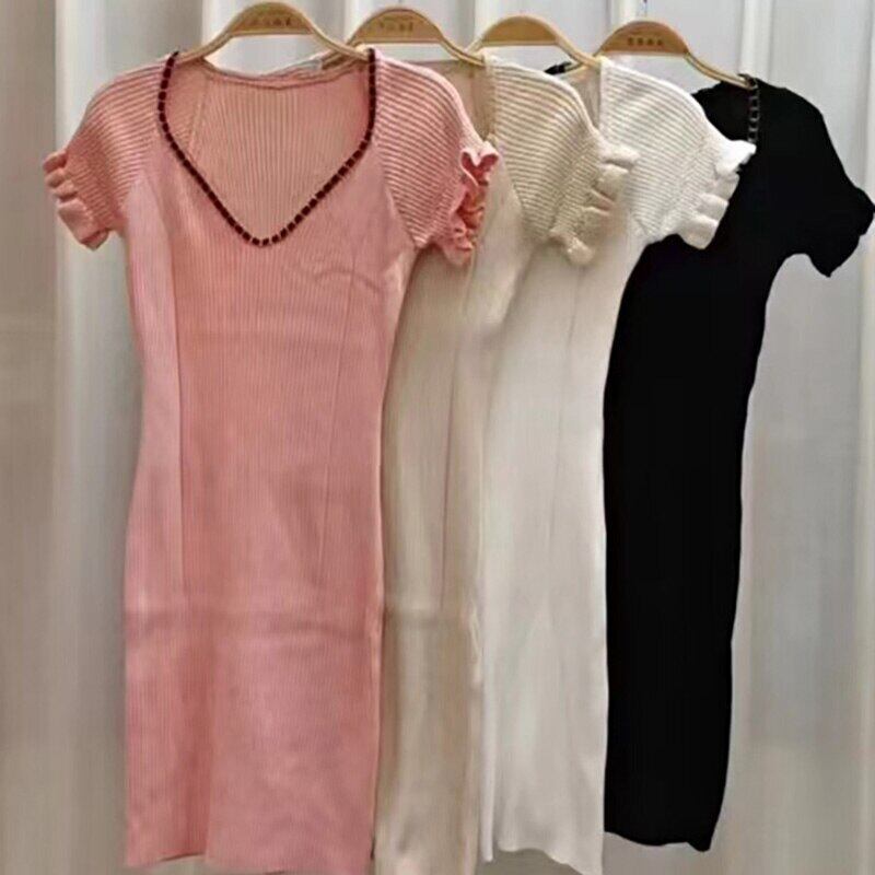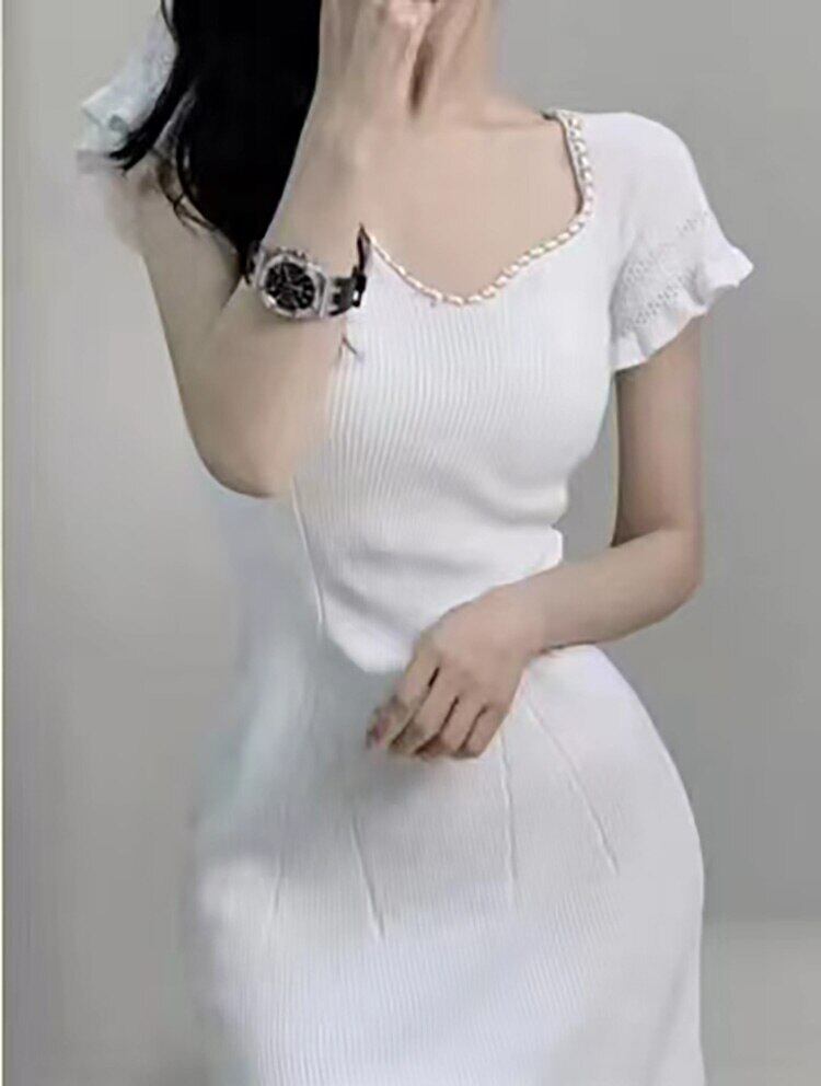 2022 夏の白いドレスの女性のセクシーな V ネック半袖ニットスカートスリム弾性の女性のドレスの女性 ショート ホワイト ハーフスリーブ エラスティック 伸縮 サマー 夏物 Vネック Son9587893132