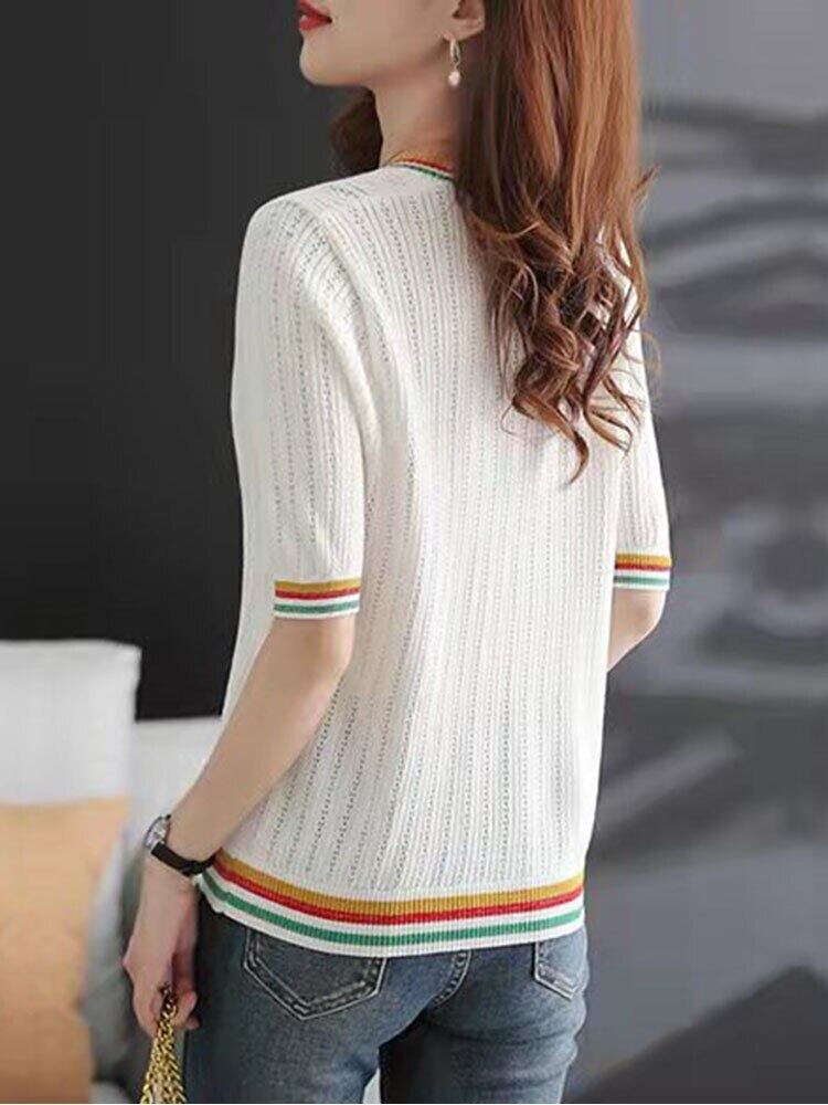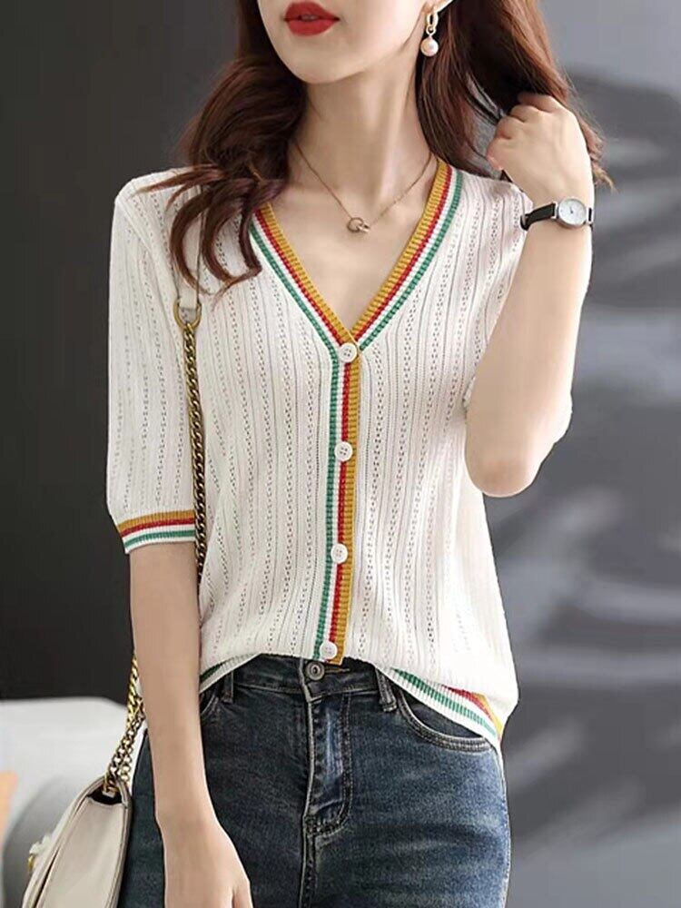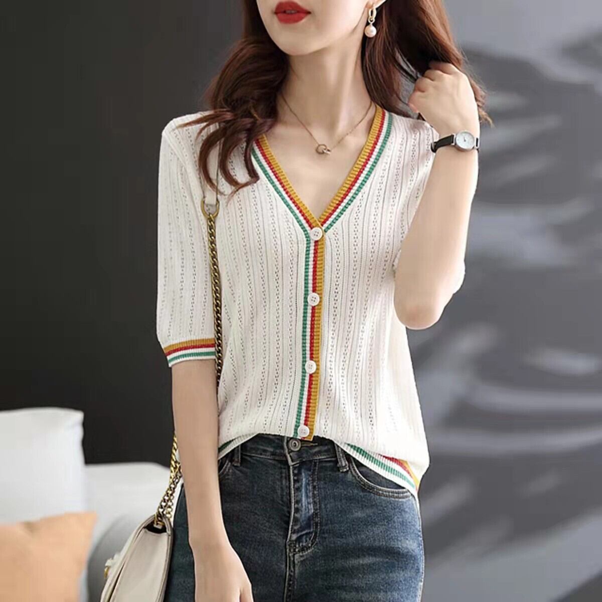 カーディガン女性セーターボタンアップトップ夏薄い 2022 半袖ニットトップス V ネックストライプセーター ショート ハーフスリーブ サマー 夏物 Vネック Son75899622200