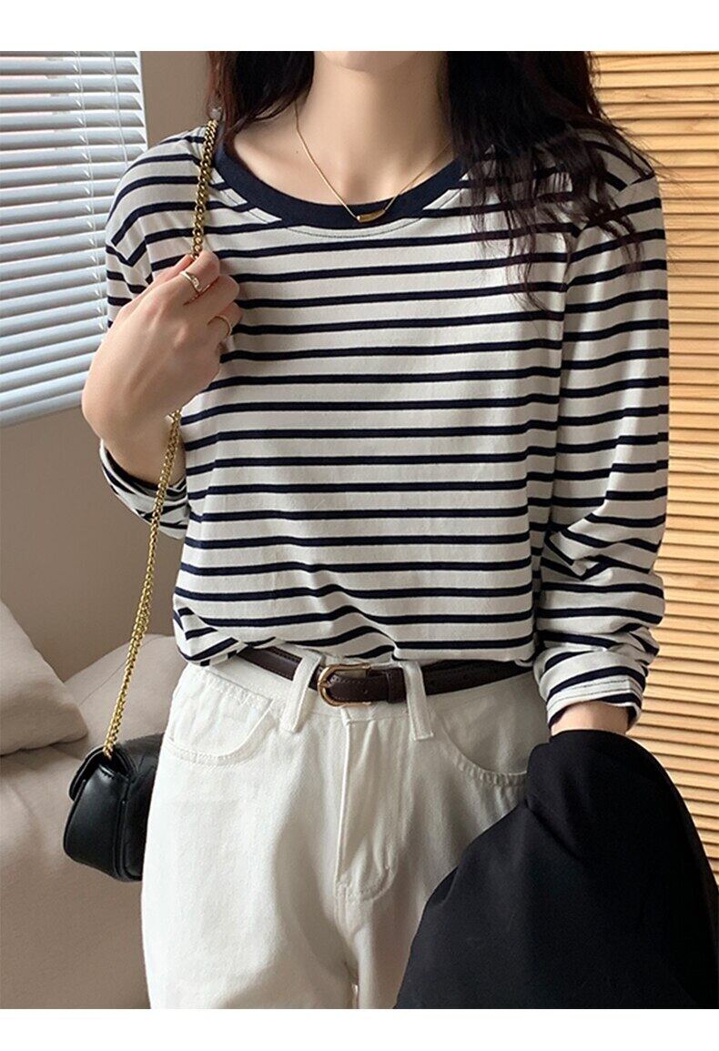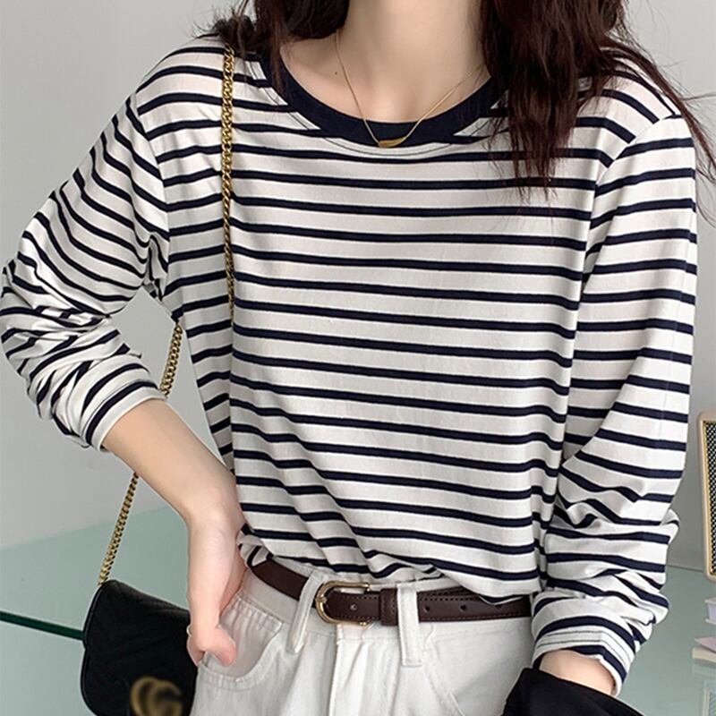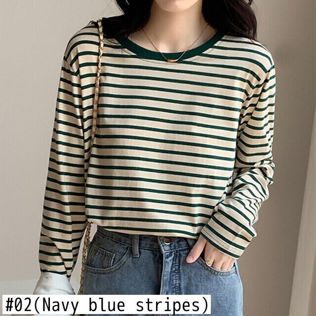 LJSXLS 春秋の女性ゆるい Y2k 服ストライプ長袖コットン Tシャツ原宿 O ネック Tシャツ Tシャツ ロング かわいい スプリング 春物 オータム 秋物 Oネック Son89198144904