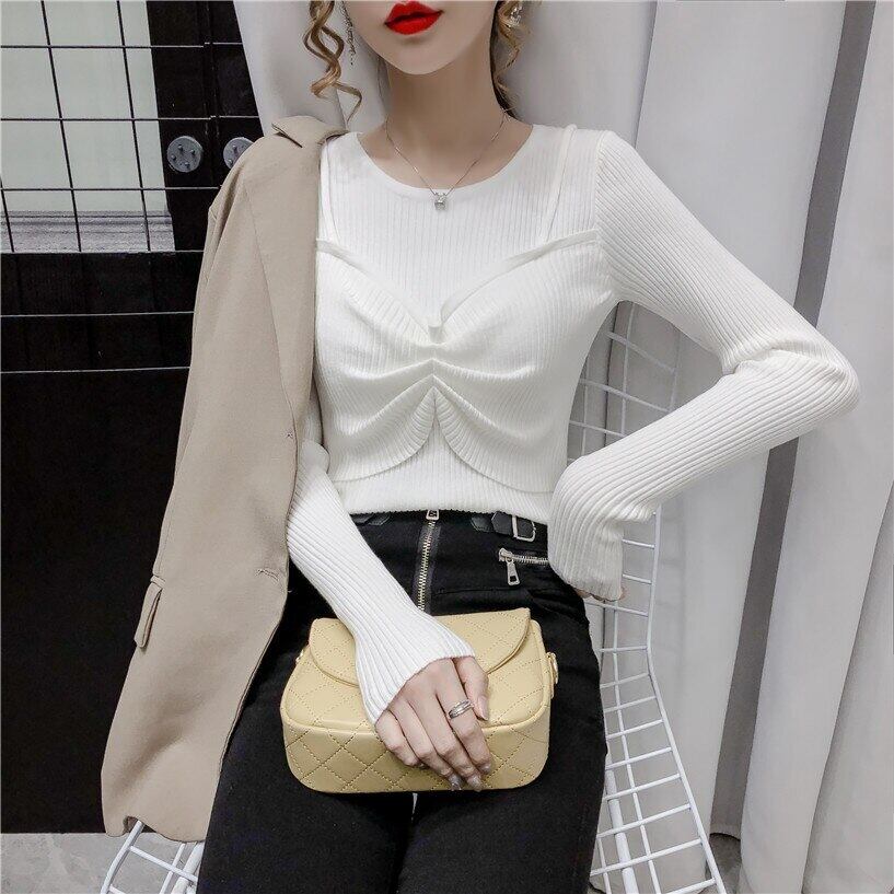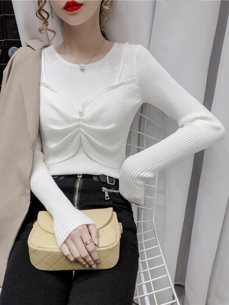 フェイクツーピースプルオーバーセーター女性 2022 秋冬長袖トップスリム弾性服ニットセーターセーター ロング エラスティック 伸縮 オータム 秋物 ウィンター 冬物 Son11191258491