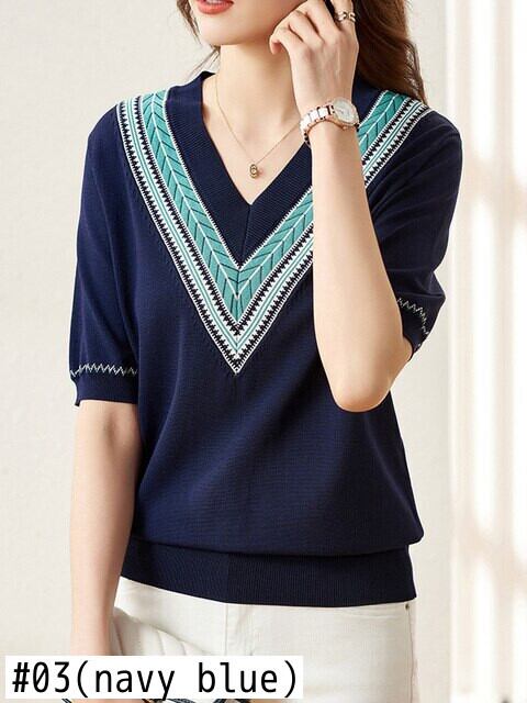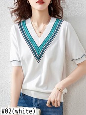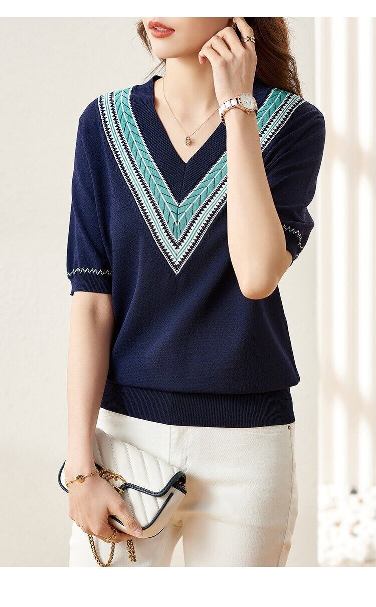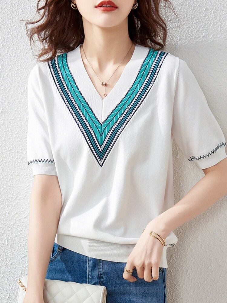 V ネック Tシャツ女性ニットトップスレディース Tシャツコントラストカラートップ半袖 Tシャツ女性服白夏 2022 ショート ホワイト ハーフスリーブ サマー 夏物 Son68837248723