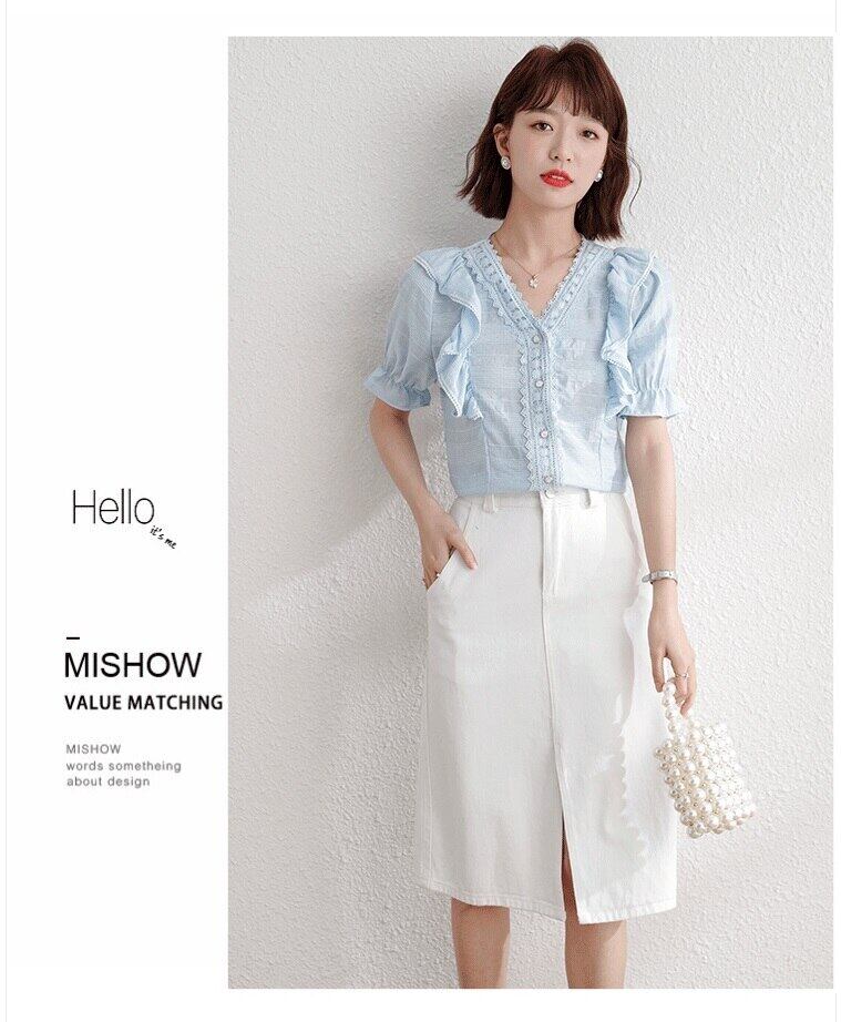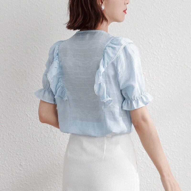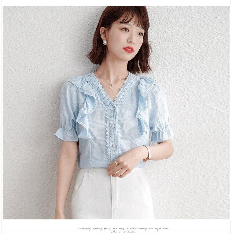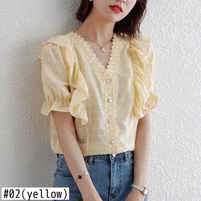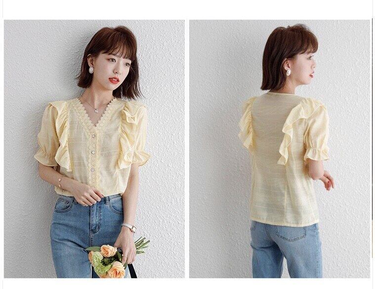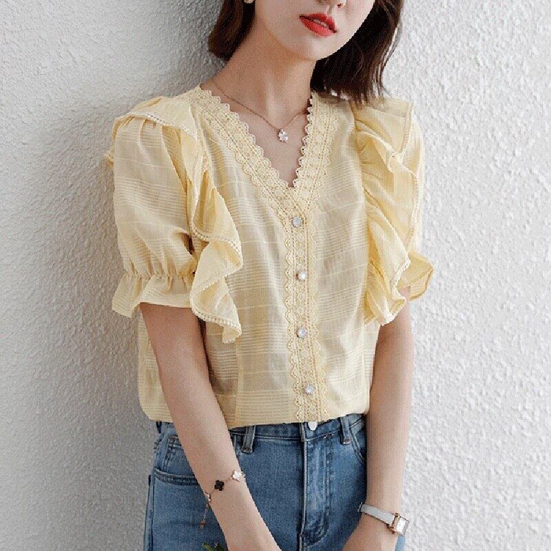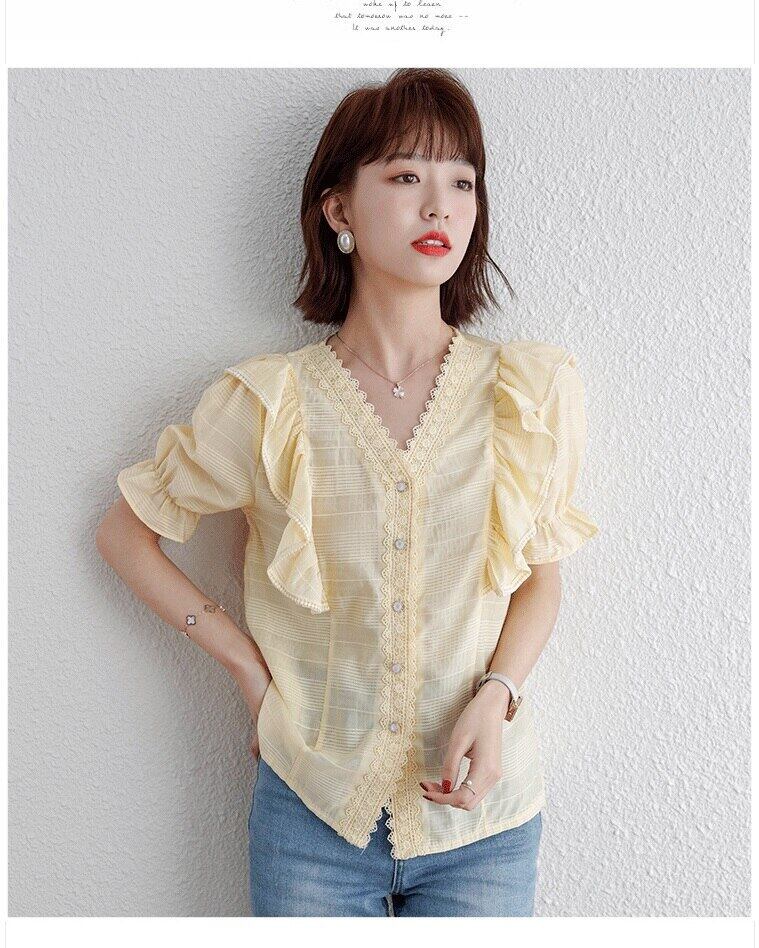 LJSXLS フリル V ネック半袖シフォンシャツ女性夏 2021 無地オフィスレディブラウストップス ショート ハーフスリーブ ラッフル サマー 夏物 Vネック ソリッドカラー 会社 学校 通勤や通学にも Son27258989536