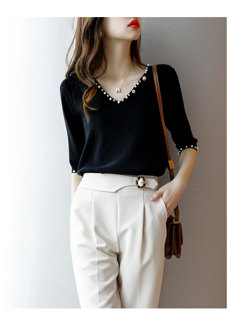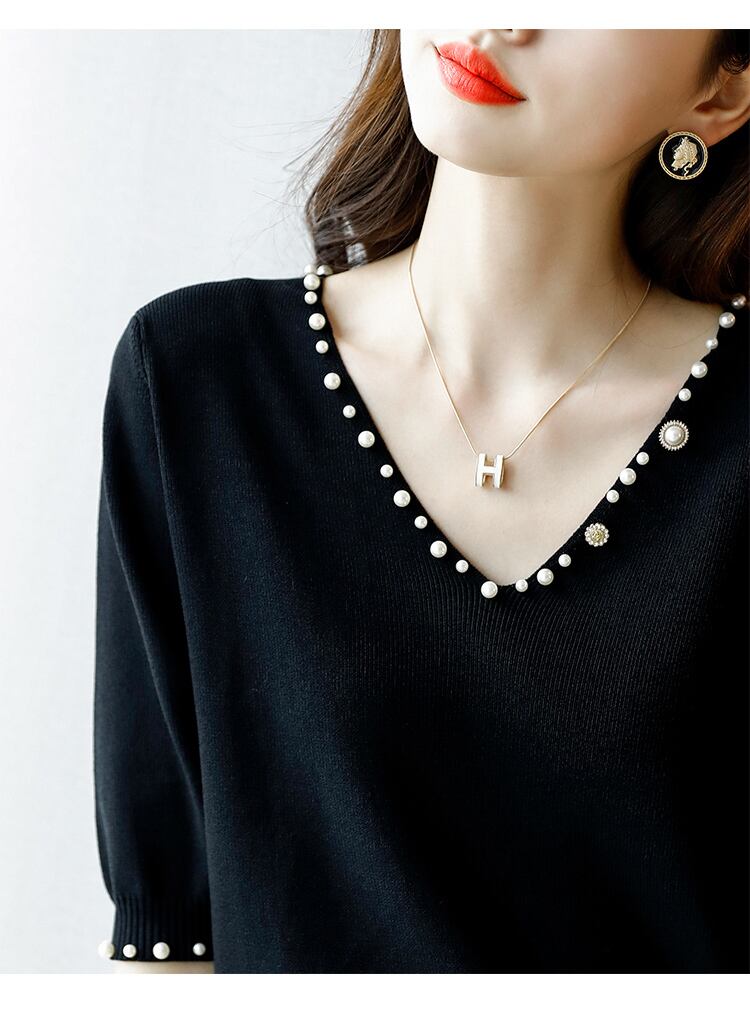 ビーズ Tシャツ V ネック女性 2022 ニットトップス夏薄型 Tシャツ半袖 Tシャツ女性服 Camiseta ショート ハーフスリーブ サマー 夏物 Vネック Son93581026542