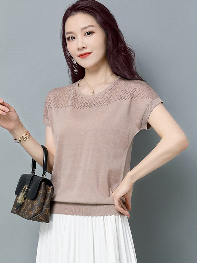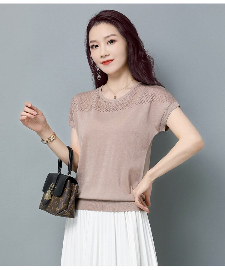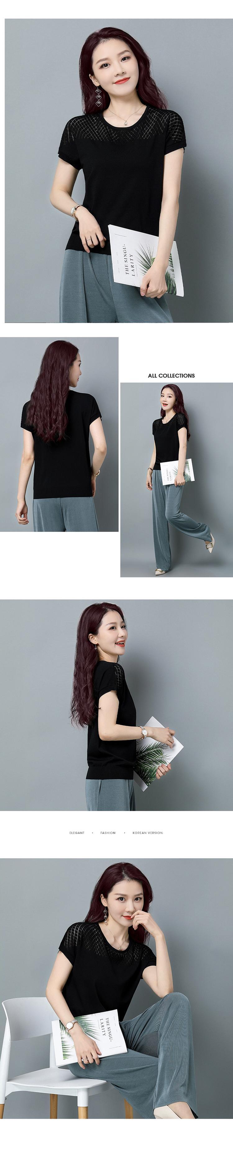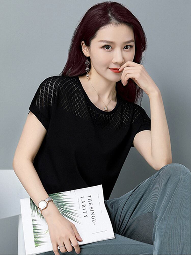 夏薄いニットトップス半袖中空アウト Tシャツ女性ルーズ Tシャツ 2023 Tシャツ Camisetas ショート ハーフスリーブ サマー 夏物 Son41925285474