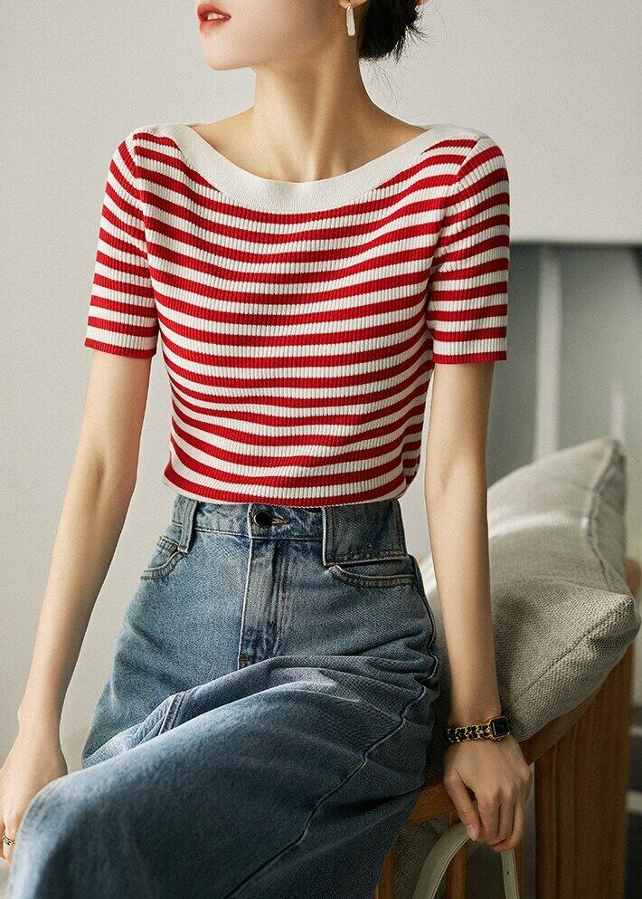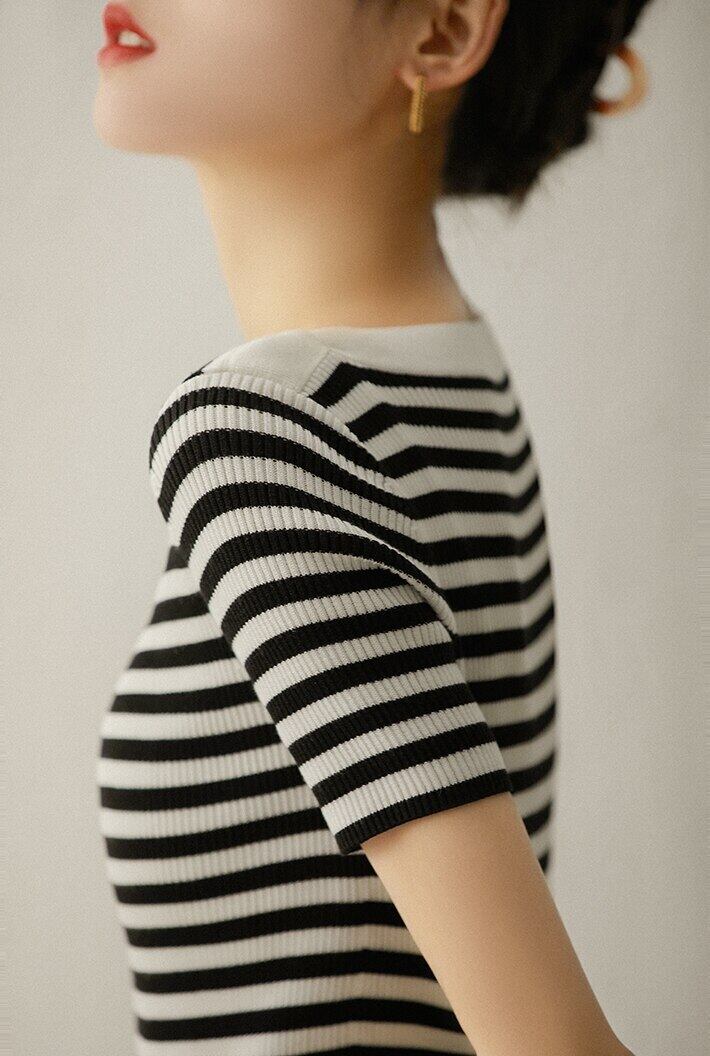 黒のストライプの Tシャツの女性のコントラストカラートップ 2022 夏ニットトップス半袖 Tシャツ Tシャツ ショート ブラック ハーフスリーブ サマー 夏物 Son32353990749