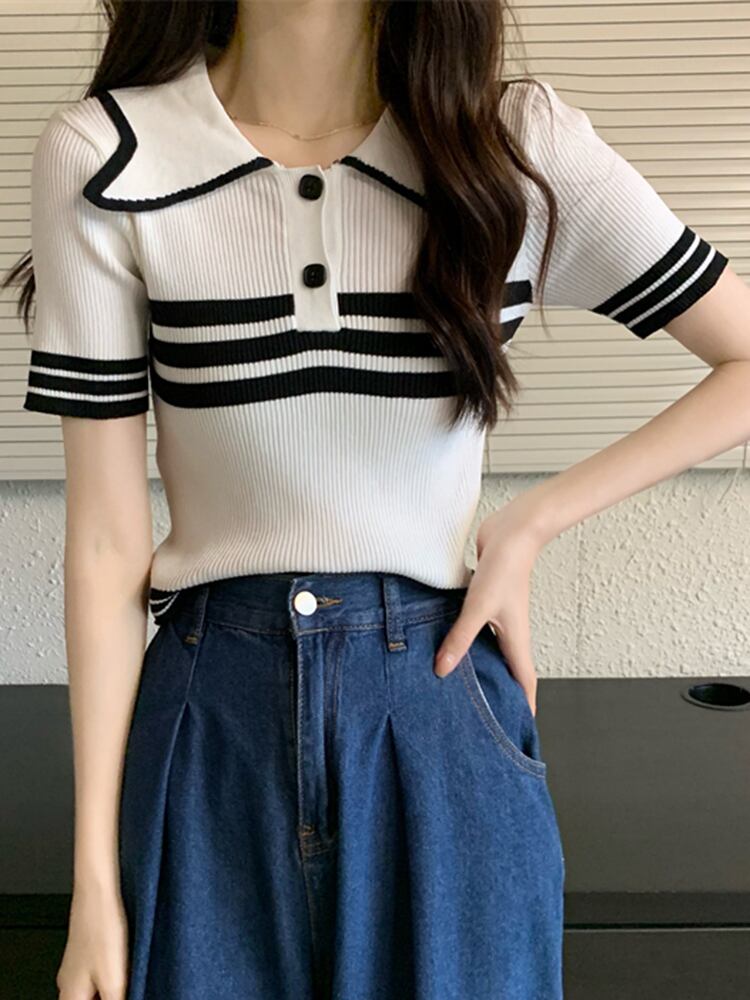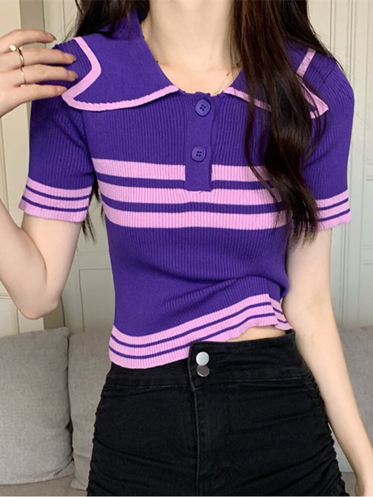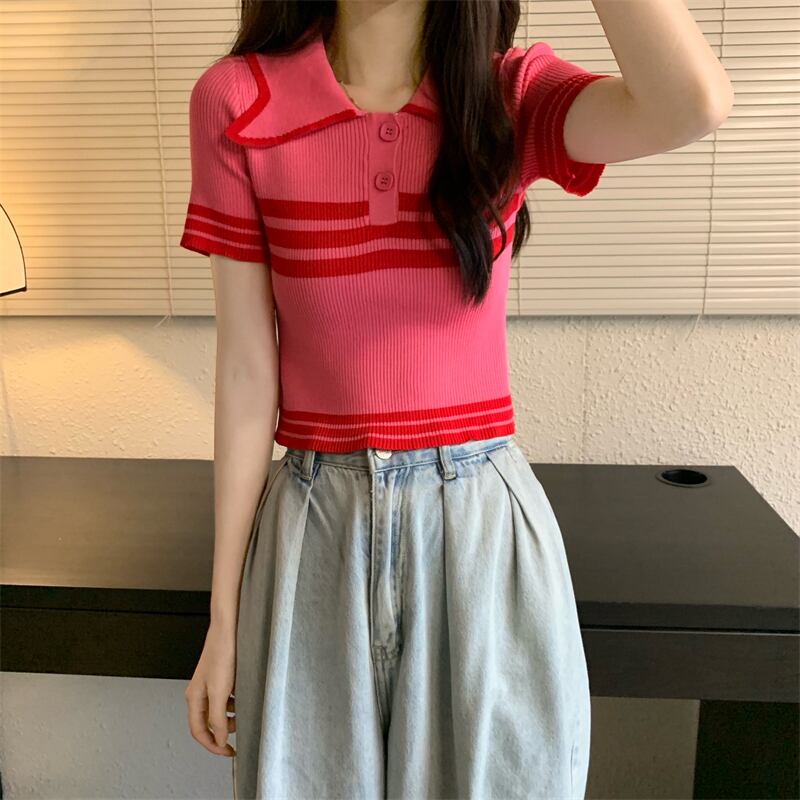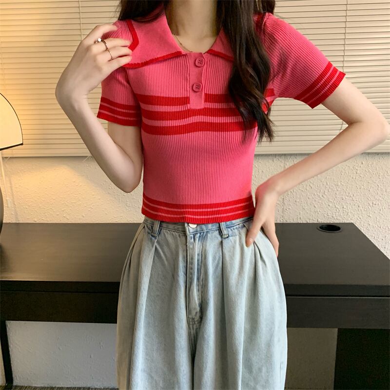2022 夏 Tシャツストライプ Tシャツ女性ニットクロップトップターンダウン襟ボタン半袖 Tシャツスリム弾性服 ショート ハーフスリーブ エラスティック 伸縮 サマー 夏物 Son5911842714
