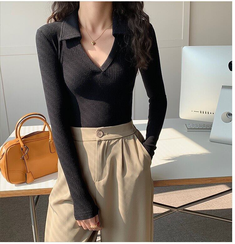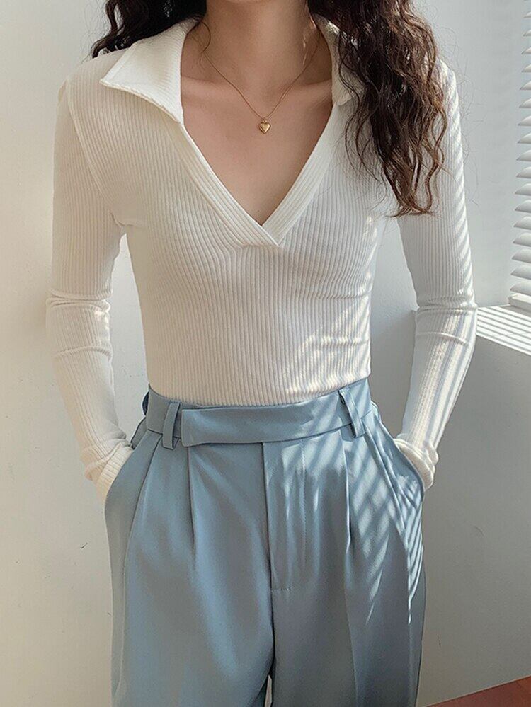 セクシーな白 V ネック長袖 Tシャツ女性春秋スリムトップスコットン Tシャツベーシック Tシャツ ロング ホワイト スプリング 春物 オータム 秋物 Vネック Son80040964837