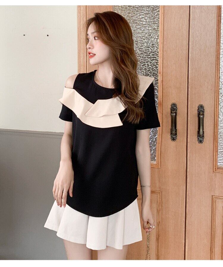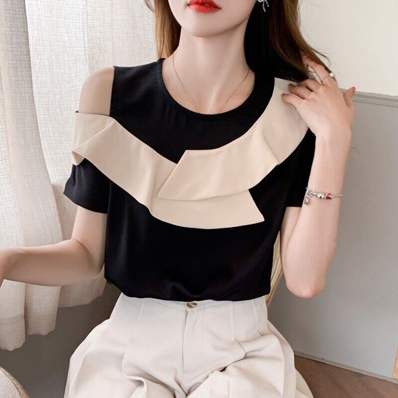 LJSXLS 夏シフォンシャツ女性フリルトップルーズ半袖女性のブラウス 2021 黒服 ショート ブラック ハーフスリーブ ラッフル サマー 夏物 Son61846710158