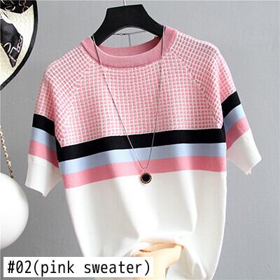 shintimes 半袖セーター女性ストライプトップ 2020 チェック柄ニットコットンスタイルの女性服 Camisetas プル ショート ハーフスリーブ Son80086738108