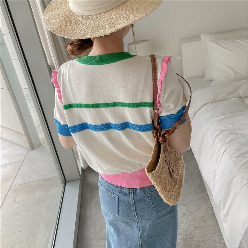 薄いルーズ O ネックプルオーバートップスヒットカラーストライプニットセーター女性 2022 夏の半袖スタイル服プル ショート ハーフスリーブ サマー 夏物 Oネック Son84999646223