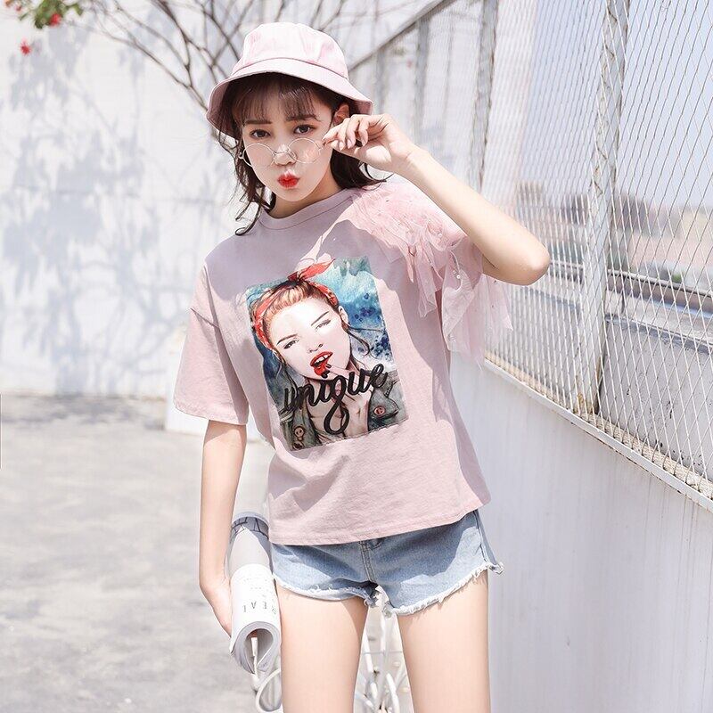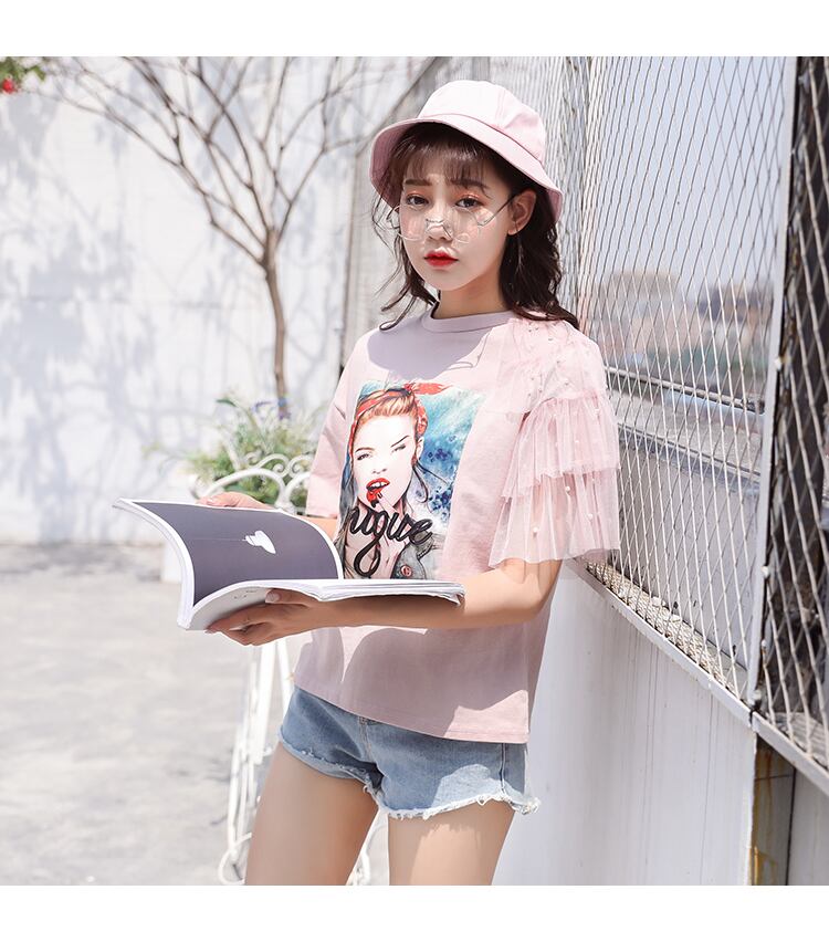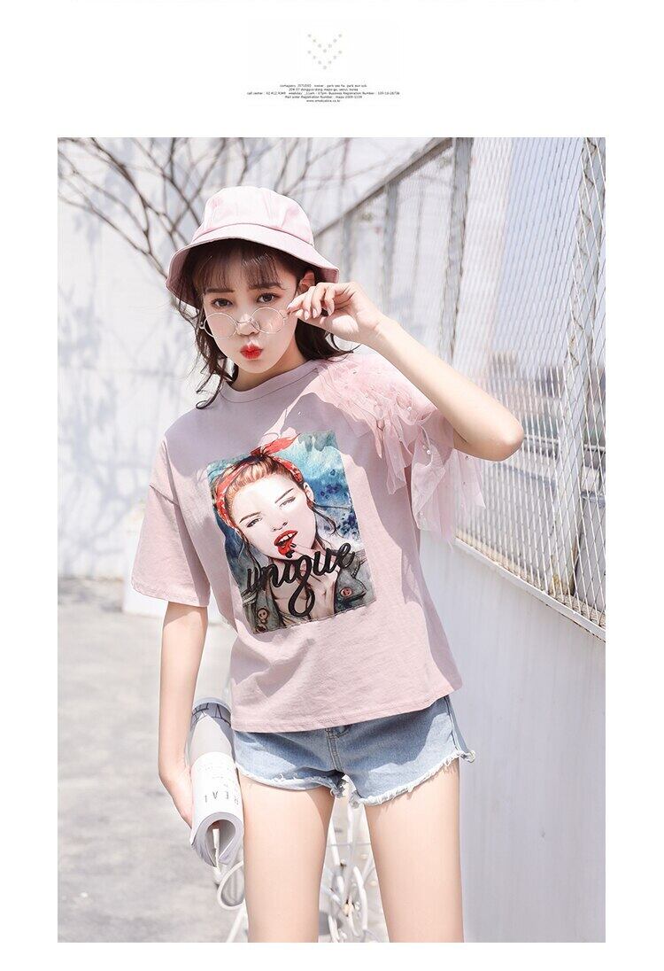 夏ピンク白綿トップレースパッチワーク半袖 Tシャツ女性ビーズかわいい服 Tシャツ ショート ホワイト コットン ハーフスリーブ 大人ガーリー スウィート キュート カジュアル サマー 夏物 Son52380546255