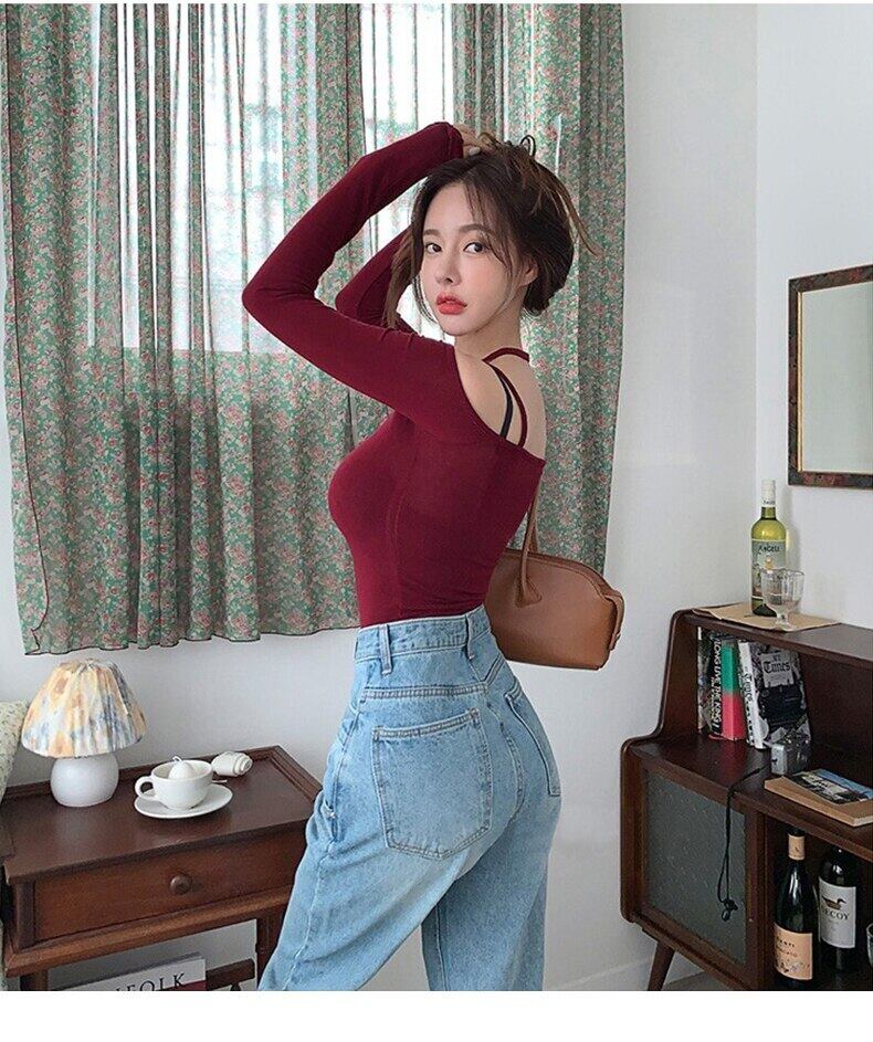 黒のセクシーなオフショルダー Tシャツ女性 2022 春秋スキニーホワイトクロップドトップス Tシャツ ブラック スプリング 春物 オータム 秋物 Son57821057590