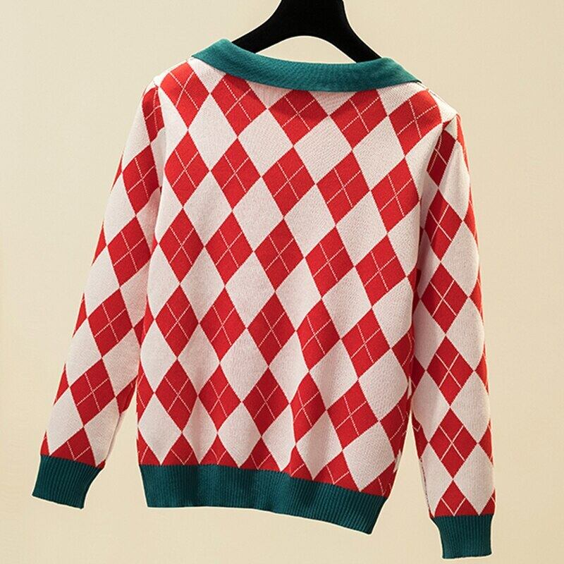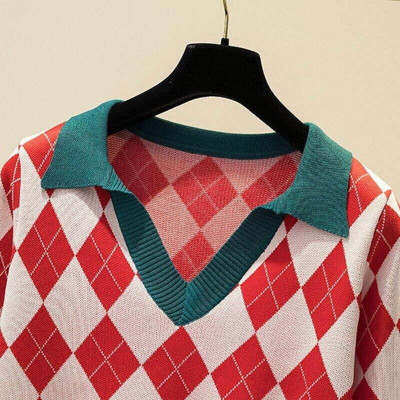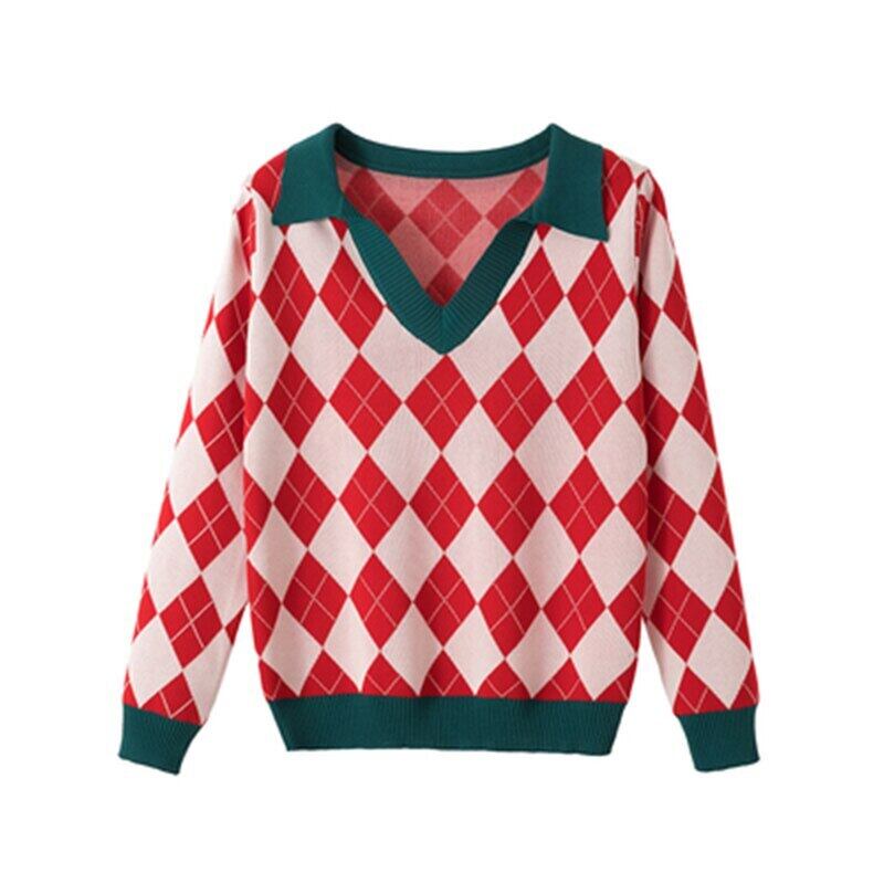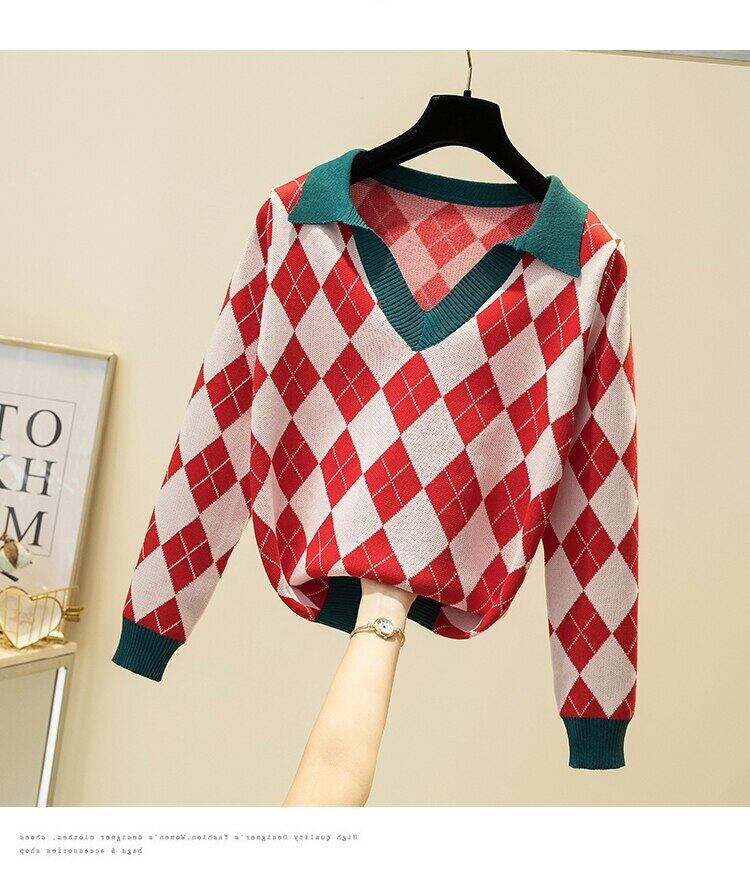LJSXLS 秋チェック柄セーター女性ポロ襟長袖セーター 2021 冬服プルオーバールーズニットトップ ロング オータム 秋物 ウィンター 冬物 Son77124114340