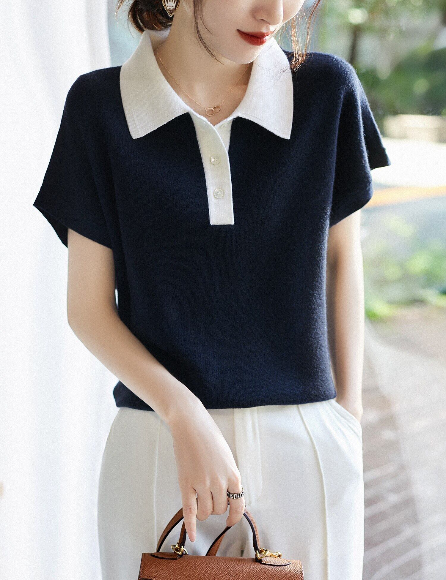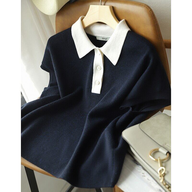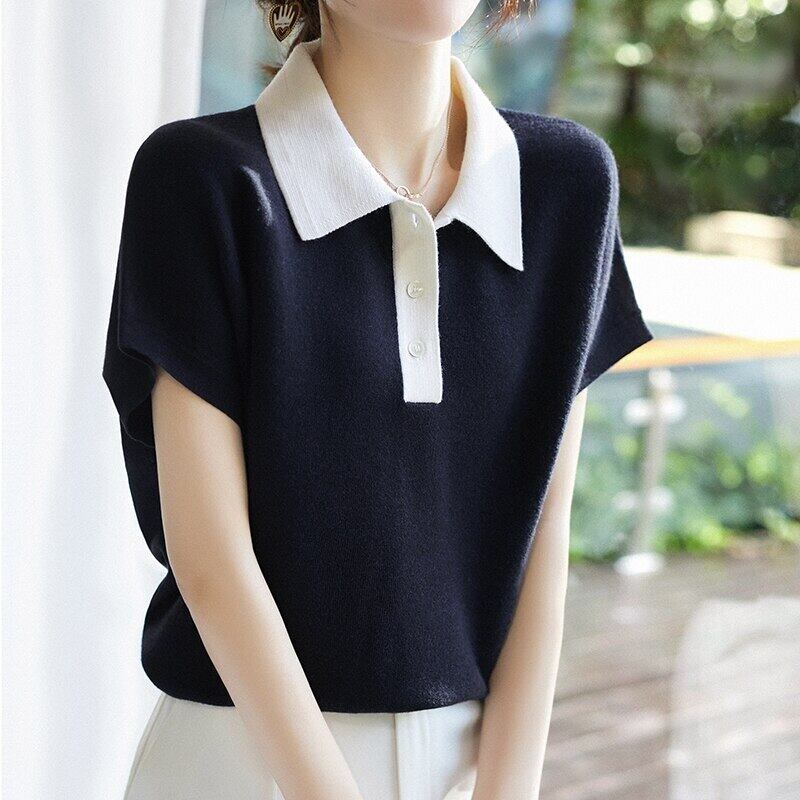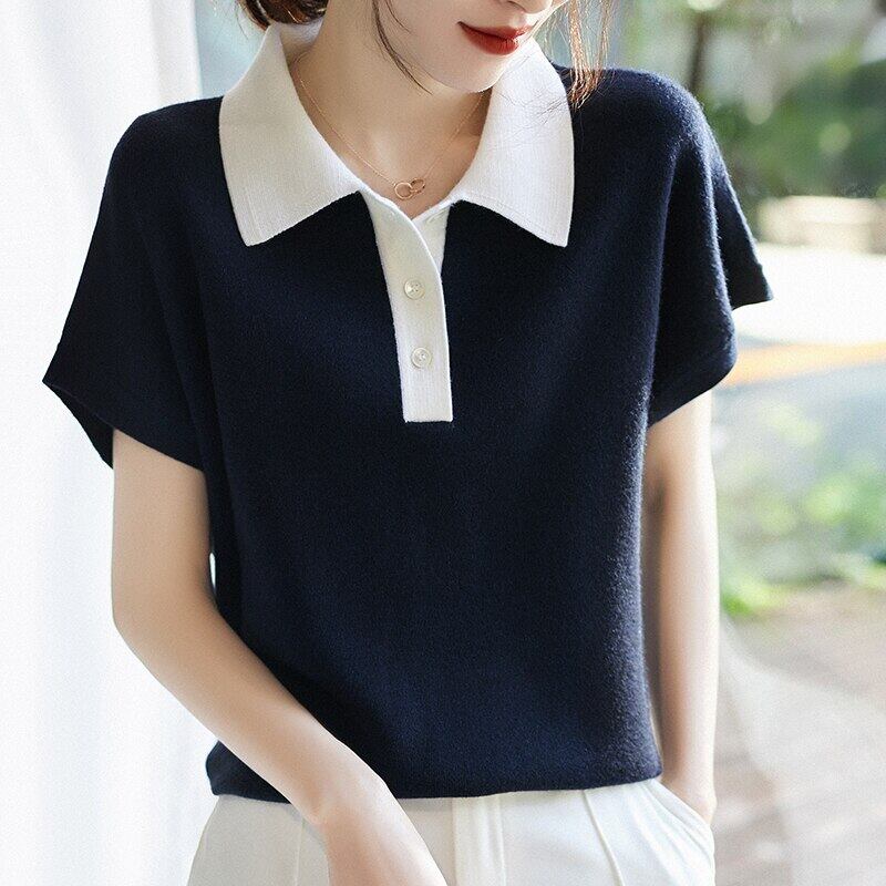 夏トップス 2022 女性服ニット半袖 Tシャツボタンターンダウン襟トップコントラストカラー Tシャツ Poleras ショート ハーフスリーブ サマー 夏物 Son93141174642